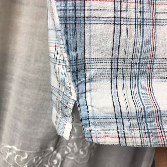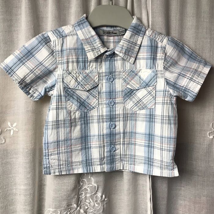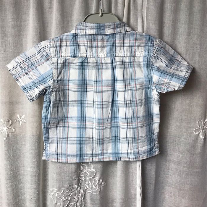 Chemise écossaise Carreaux blanc et bleu Manches courtes Fendue sur les côtés Taille 6 mois 67 cm 100% coton Tape à l’œil