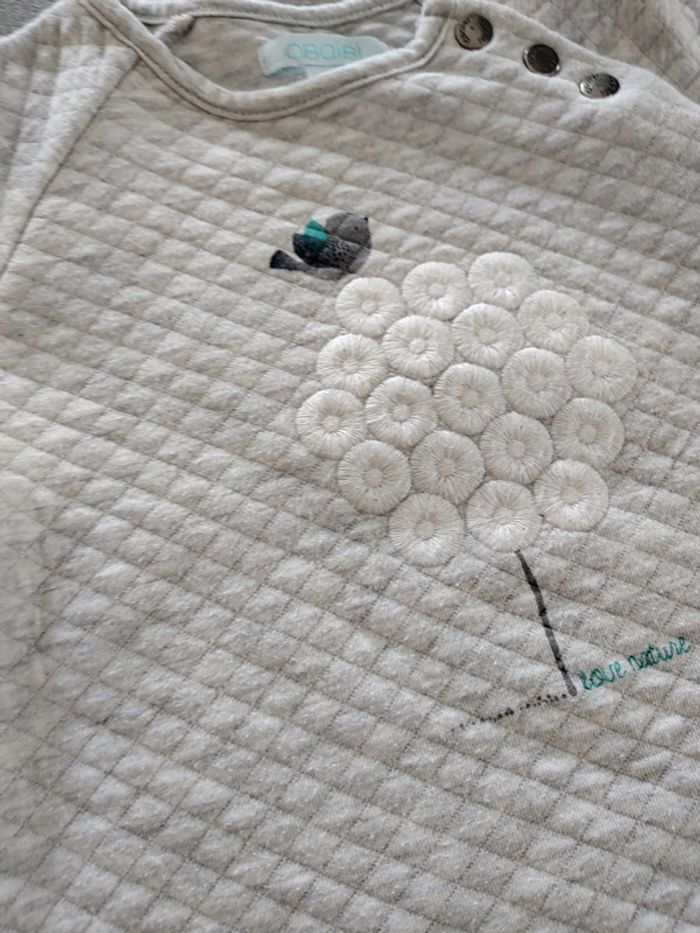 Ensemble Obaibi composé de • 1 pull avec boutons à l'épaule . Motif oiseau et arbre . Manches à revers • 1 short avec poches avants et arrières. Taille réglable par boutons intérieurs. Taille 18 mois (80 cm) Foyer non fumeur