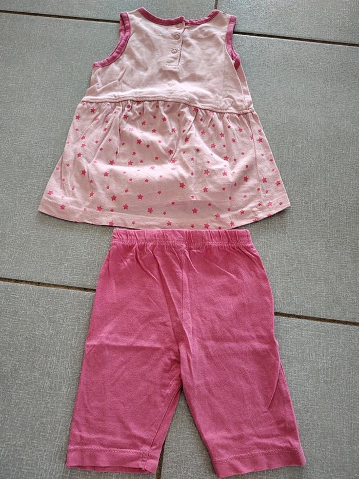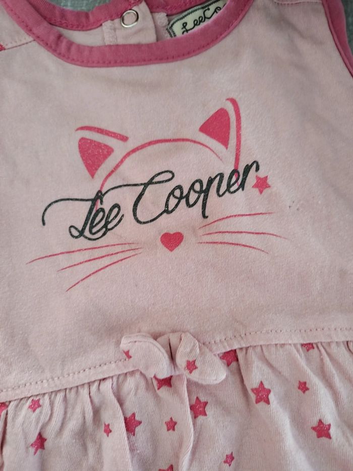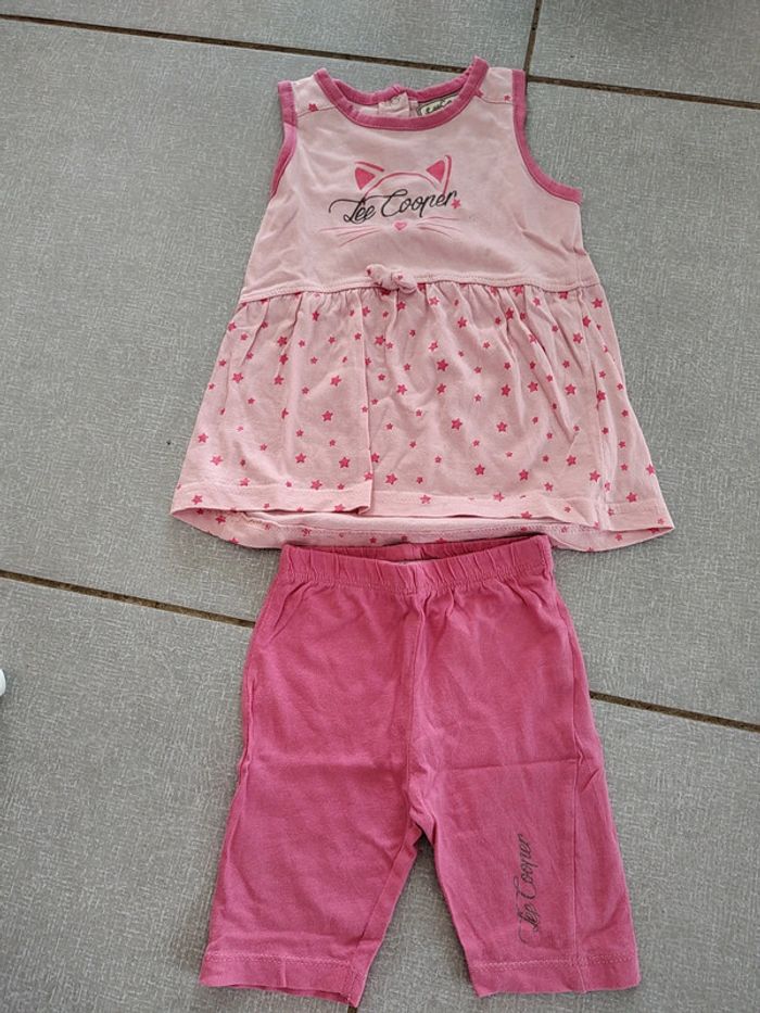 Ensemble composé de • 1 débardeur long (tunique) avec boutons pression à l'arrière. Motif étoiles et chat • 1 legging court avec inscription Lee Cooper au bas de la jambe Taille 18 mois 100% coton Foyer non fumeur
