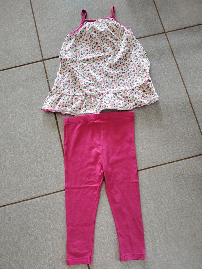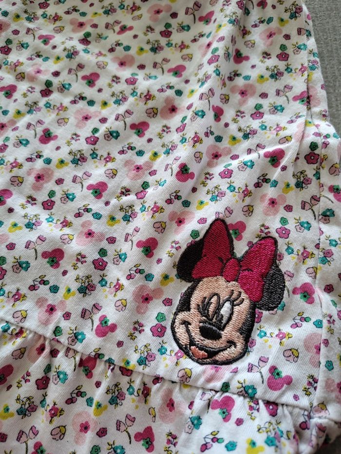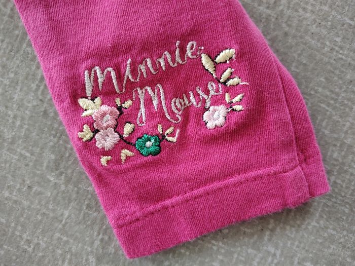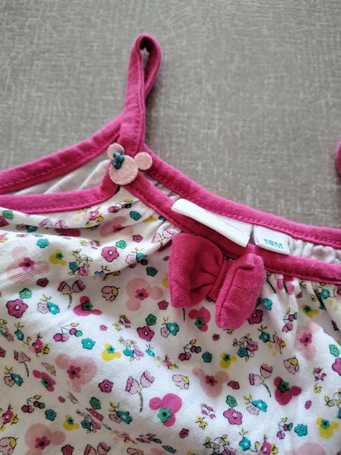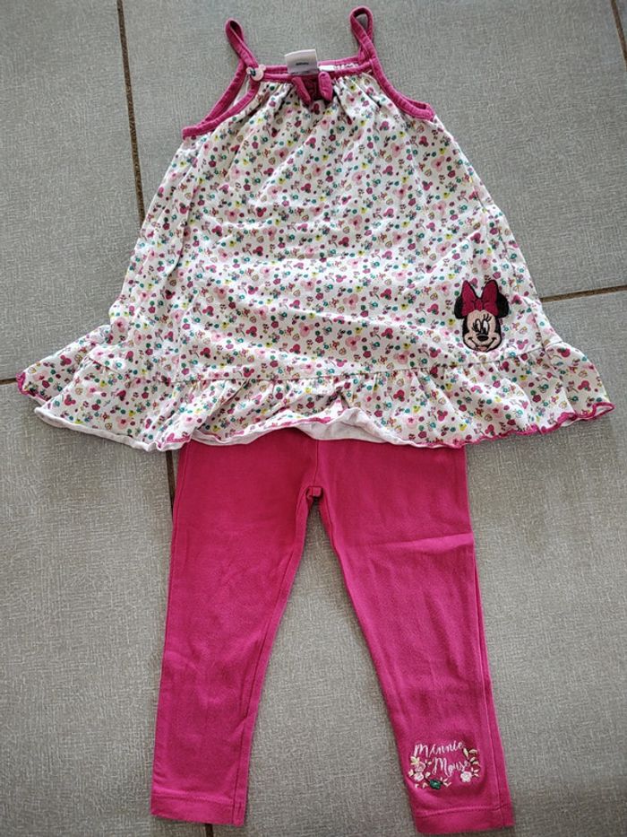 Ensemble Disney baby composé de : • 1 robe à bretelles motif fleurs et Minnie avec noeud décoratif • 1 legging inscription Minnie mouse au bas de la jambe 95% coton 5% elasthane. Taille 18 mois Foyer non fumeur