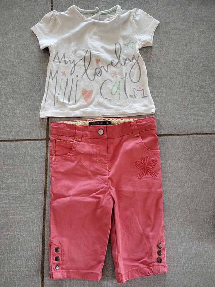 Ensemble Orchestra composé de • 1 t-shirt "my lovely mini cat" avec boutons pression à l'arrière • 1 pantacourt avec poches à l'avant et à l'arrière. Dessin brodé de papillon. Taille réglable avec boutons intérieurs. Boutons pression au bas des jambes Taille 18 Mois (81 cm) Foyer non fumeur