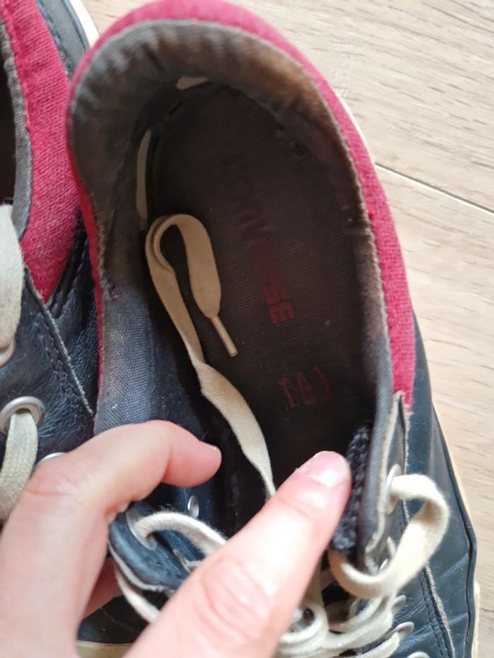 Paire de converse en cuir noires et rouges Avec renfort à l'arrière Originales Taille 7 soit 40 Je les ai beaucoup portées. Elles ne sont donc plus en très bon état notamment au niveau de la semelle sur le côté (voir photo) mais elles pourront encore faire le bonheur de quelqu'un #converse #noir #rouge #cuir #converseallstar