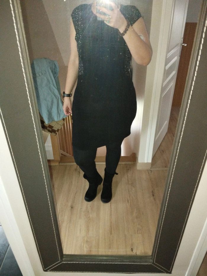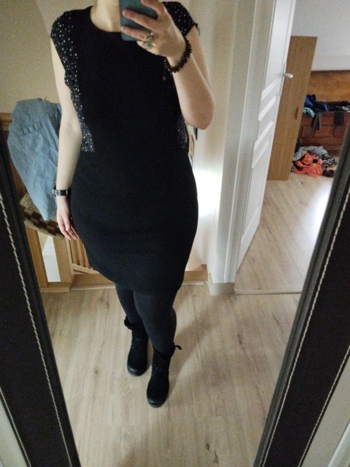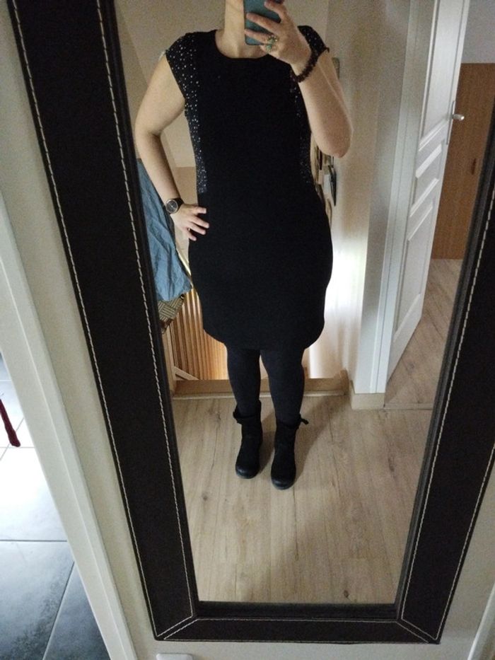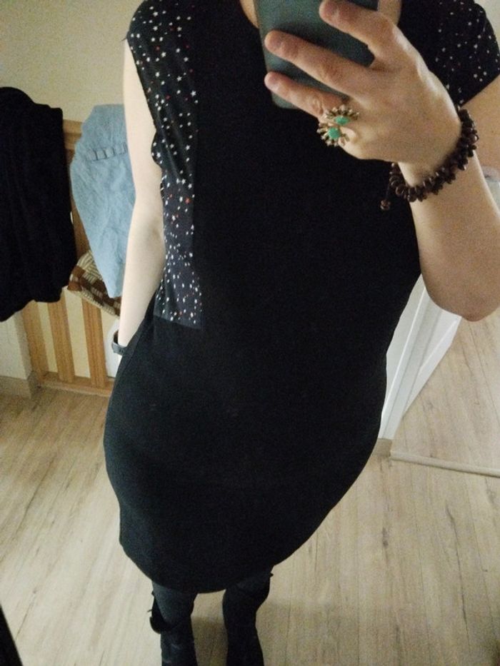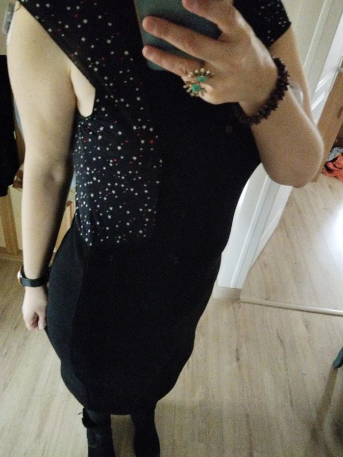 Jolie robe de marque scottage Noire Près du corps Avec imprimés étoiles aux manches et sur le coté Taille 42 Forme crayon Sexy et extensible pour plus de confort Très sympa pour un look working girl élégant #elegant #workinggirl #etoiles #etoile #scottage #robenoire #petiterobenoire