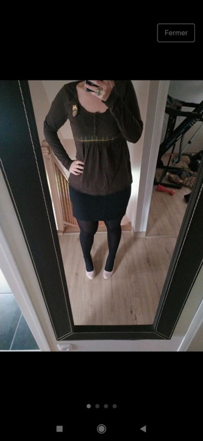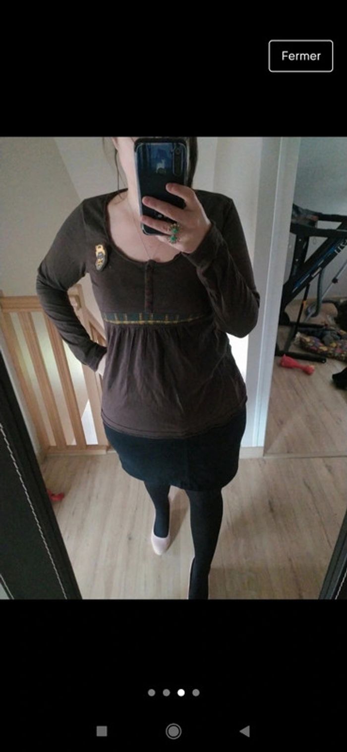 T-shirt manches longues Marque bonobo Marron Avec ceinture à la taille jaune et verte Avec petite broché hibou Fait un joli décolleté Il n'y a pas de taille affichée mais je penche pour un L #tshirt #mancheslongues #bonobo #tailleL #hibou #chouette