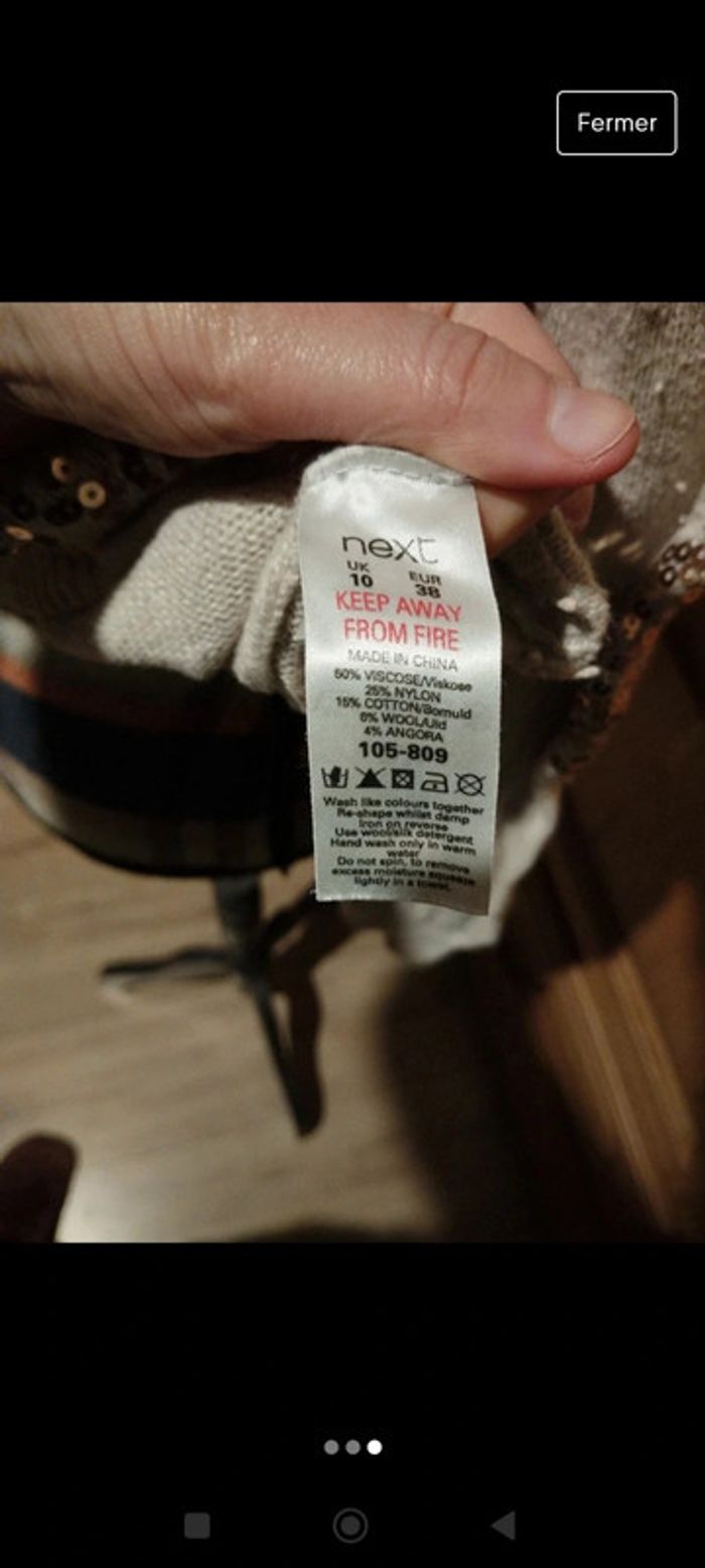 Joli petit pull fin 6% laine 4% angora Attention il a pas mal de bouloches Next Taille 38 Avec sequins #sequins #sequin #paillettes #angora #laine #next