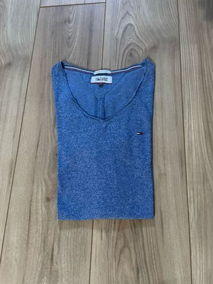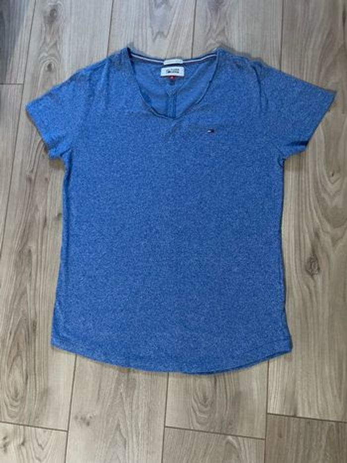 T-shirt Tommy Hilfiger bleu Taille S Coton (50%), polyester (50%) Manches courtes Col V Sans fermeture Très bon état