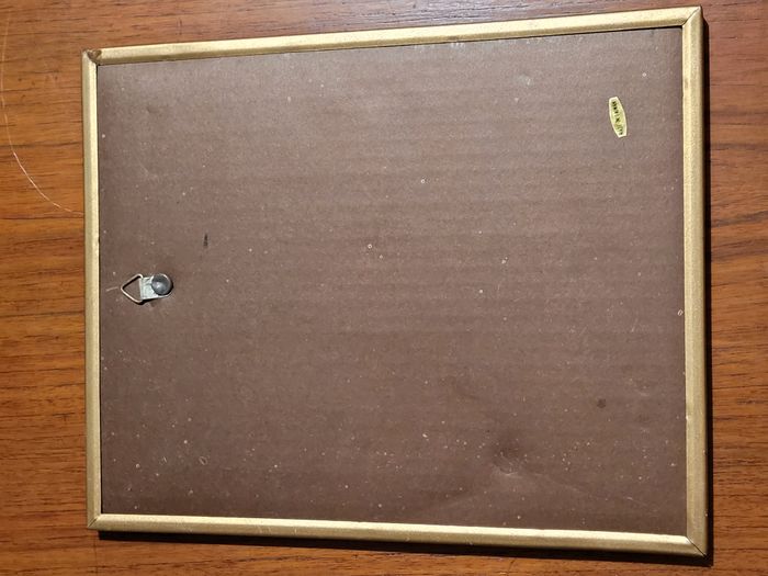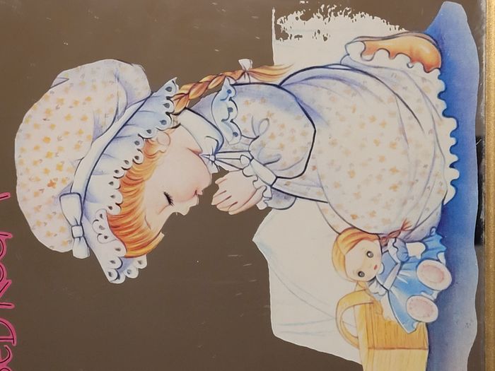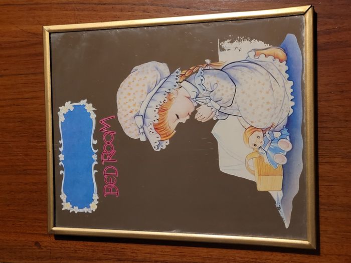 années 70 / 80 on peut écrire un prénom sur l'étiquette bleue motif : petit fille dans le style Sarah Kay encadrement en métal doré dimensions 25 x 20 cm made in Taiwan