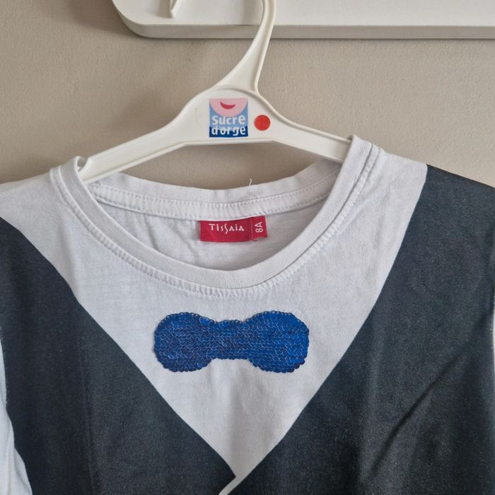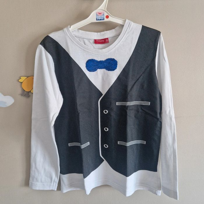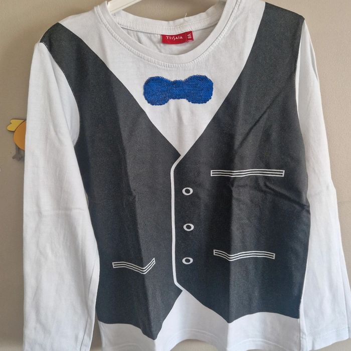 Tee-shirt garçon façon costume avec noeud papillon en sequins, taille 8 ans (126 cm). 100% coton. Bien porté mais reste correct, présence d'une auréole jaune sur le bord d'une manche (manche de gauche quand on regarde le tee-shirt) : cf photo mais se voit difficilement sur la photo) #garçon8ansgain_de_place