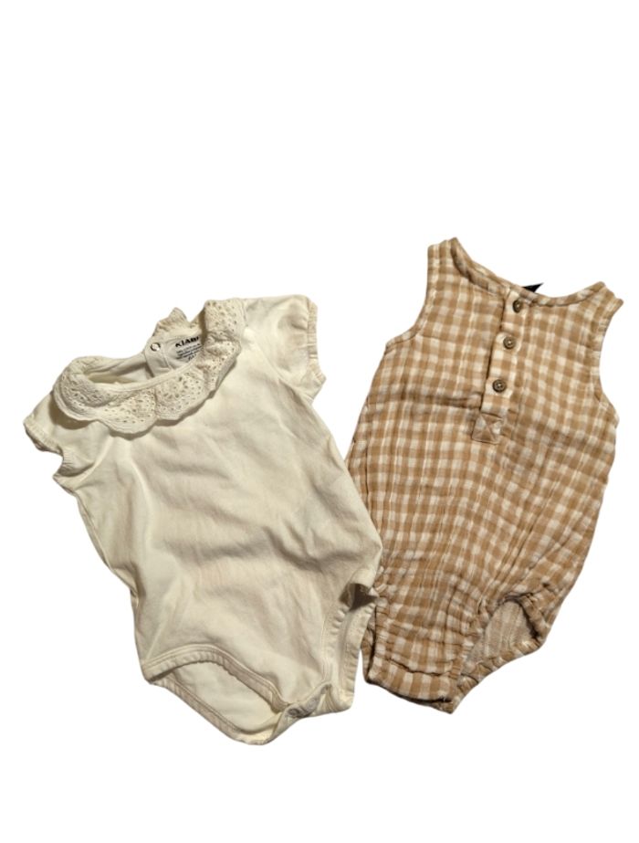 Voici un lot de vêtements 6 mois Il y a 8 pièces Il est composé: • 1 combinaison jaune plumetis (63-69cm) Kiabi • 1 combinaison blanche, bleu et rouge Sergent Major (68cm) • 2 combinaisons - 1 saumon (63-69cm) Kiabi - 1 rose pâle (63-69cm) Kiabi • 2 bodies - 1 a carreaux beige et blanc (67cm) Kiabi - 1 blanc col broderie anglaise (67cm) Kiabi • 1 robe blanche plumetis (67cm) By Kloane • 1 t-shirt blanc manches violentées Gémo Lot en très bon état !