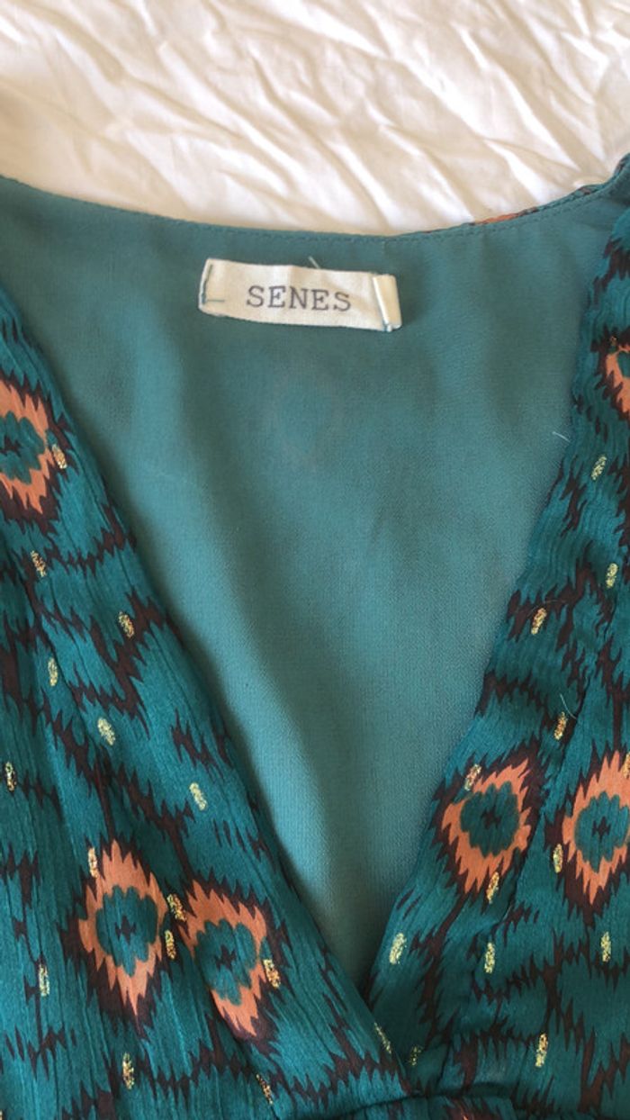 Très jolie robe couleur vert bleu canard motifs un peu rouille et petit détail doré avec un volant très joli décolleté petites manches transparente #RobeS #Robe #RobeVerte #Bleu #RobeVerteS #RobeActuelle #RobeMode #RobeModeS