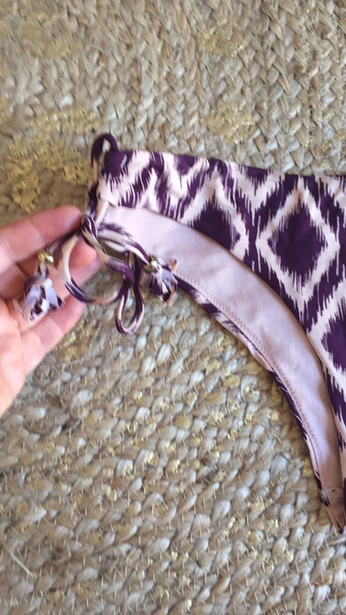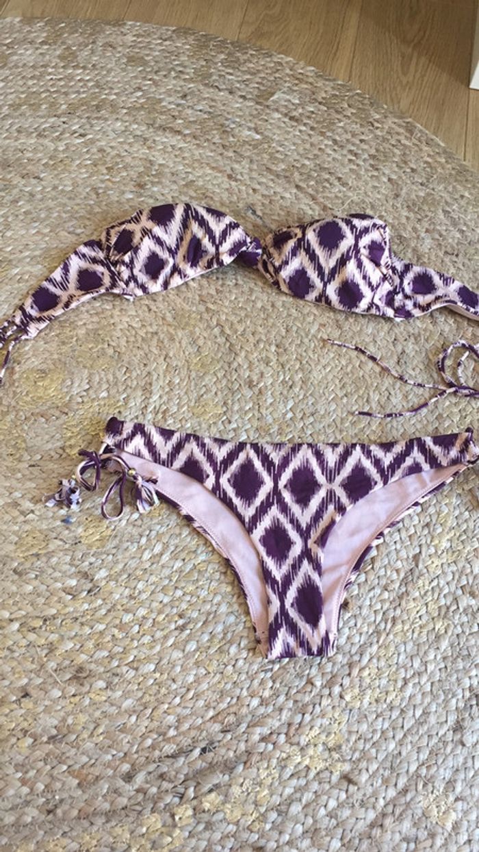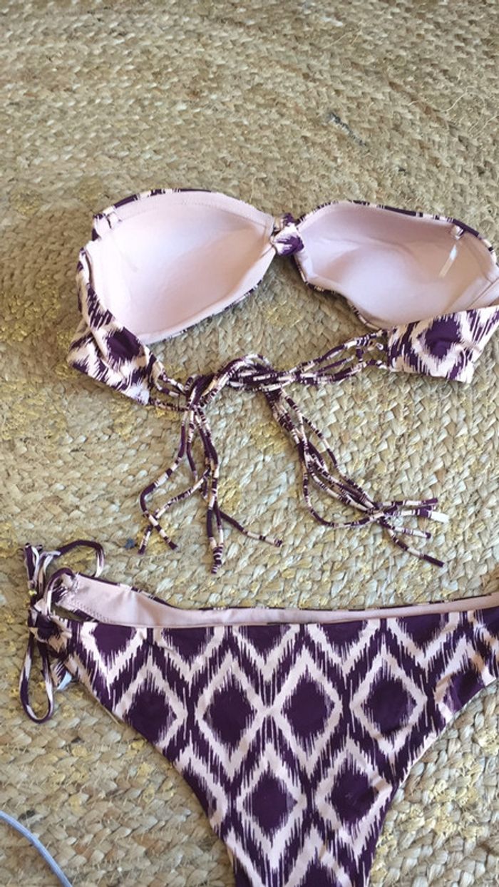 Très beau maillot forme originale de pièces au balconnet petits nœuds sur les côtés forme très féminine très seyante motif ethnique #maillot2pieces #MaillotViolet #MaillotRosePoudré #MaillotS #Maillot36