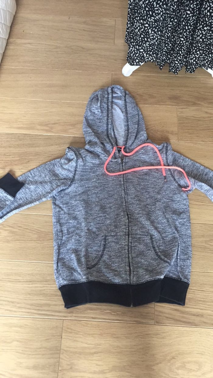 Jolie veste à capuche gris chiné avec cordon orange fluo très pratique est assez légère elle est en coton et polyester #capuche #VesteCapuche #VesteDeSport #VesteS #VesteDeSportS #VesteCapucheS #TailleS #VesteGrise #VesteGriseS #Sweet #SweetÀCapuche