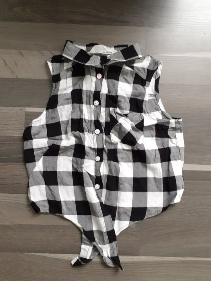 Très jolie blouse à carreaux noirs et blancs, sans manches, petite poche sur la poitrine, à nouer. Taille : 10 ans Marque : H&M Parfait état, portée deux fois
