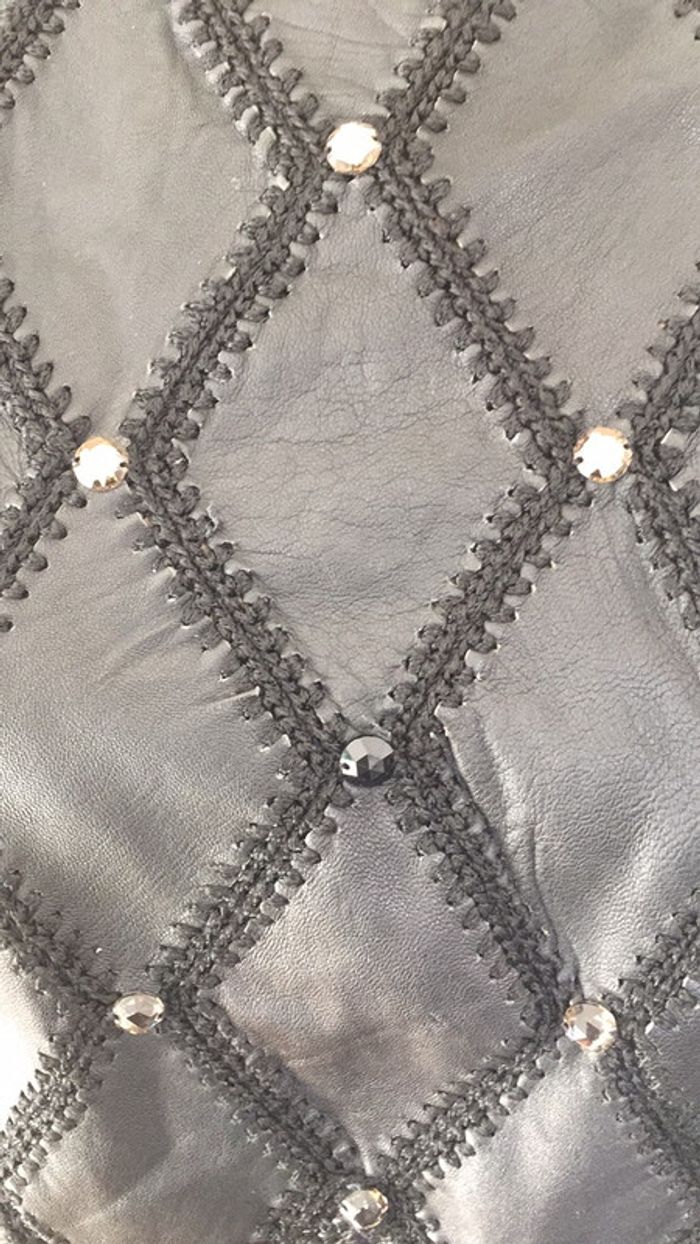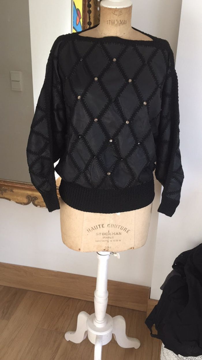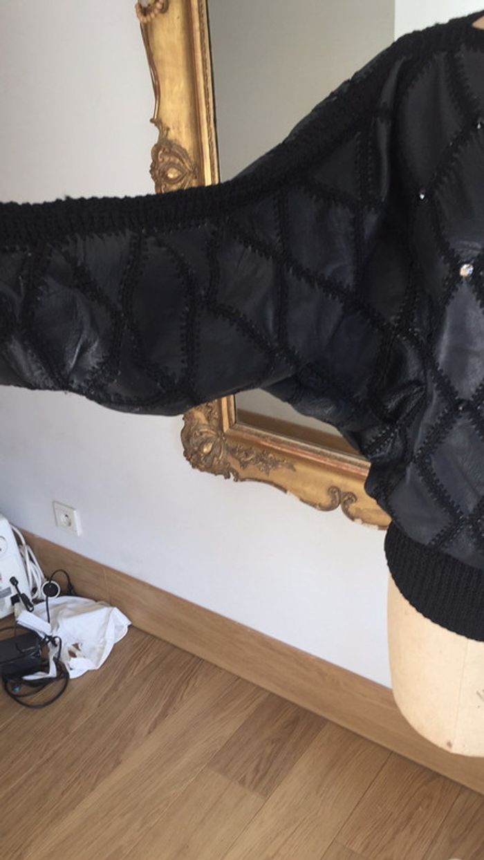 superbe Pull en cuir vintage très bon état quelques strass mettent en valeur les losanges Les cuirs sont des losanges assemblés entre eux longueur 60cm manches chauves souris #PullCuirVintage #pullencuir #pulllnoir #PullOverSize