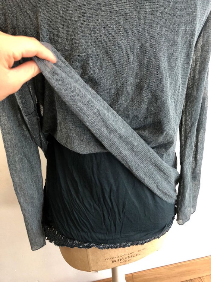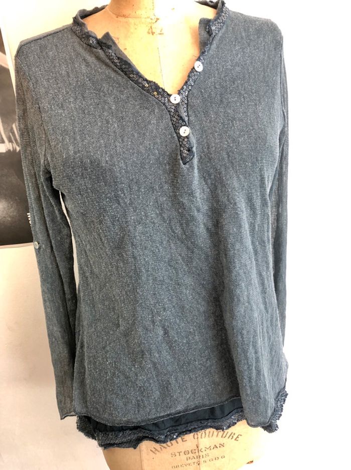 T shirt taille unique de couleur gris bleuté, le haut est tout doublé, ce qui est très sympa, il y a seulement les manches de transparentes. Le col V se ferme avec des petits boutons nacrés. La doublure dépasse en dessous avec des petits sequins c'est très joli. Le haut est made in Italy #hauttailleunique #tshirttailleunique #tunisientailleunique #tunisiengris #tunisiengrissequins #sequins #hautcolv #hautcolvgris #hautdoublé #zara #hm #zadigetvoltaire #sezane #abercrombie #maje #sandro #bash #mango #nike #adidas #comptoirdescotonniers #vintage #vintagelove #vintagedressing #vintagestyle #sudexpress #thekooples #cachemire #americanretro #americanvintage #ltp #goldengoose #superstar #semerdjian #meline #texto #berenice #victoriasecret #princesstamtam #etam