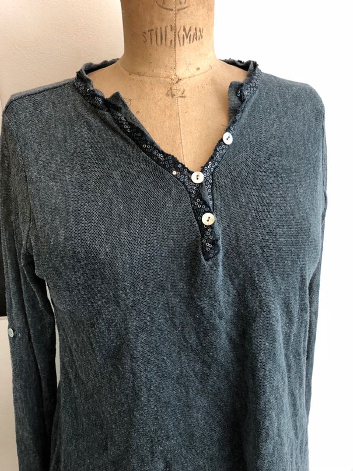 T shirt col tunisien gris bleuté col V boutons nacrés / t-shirt taille unique vintage - photo numéro 3