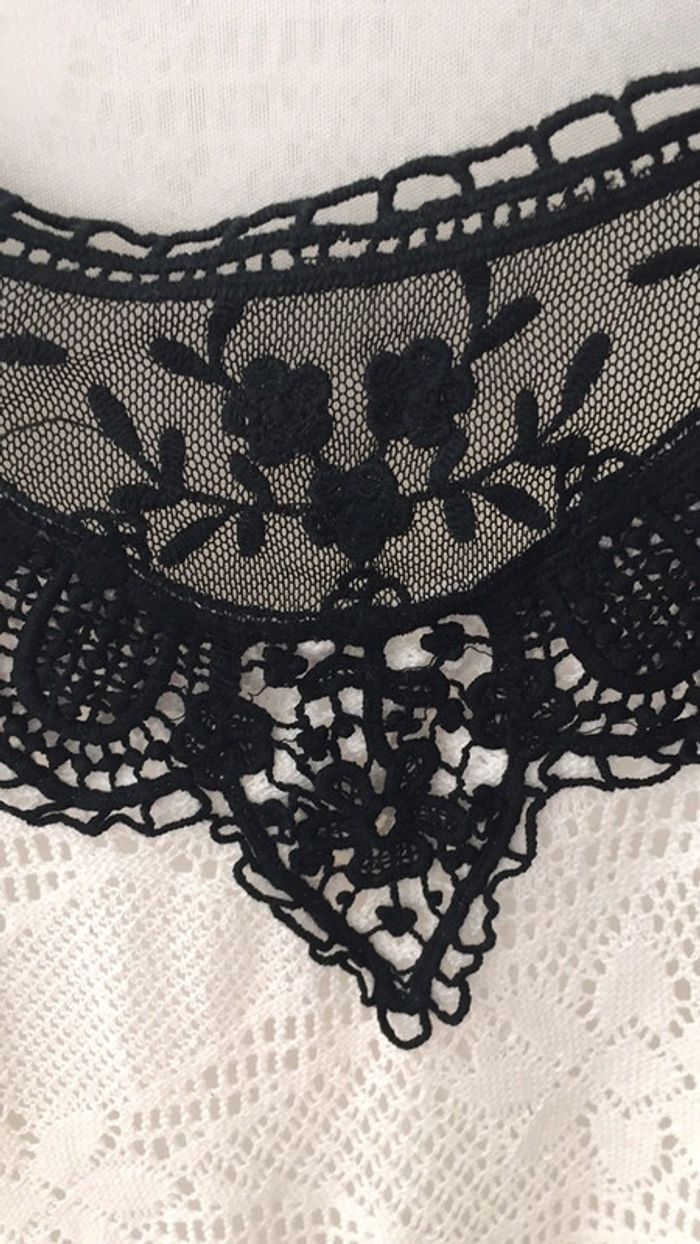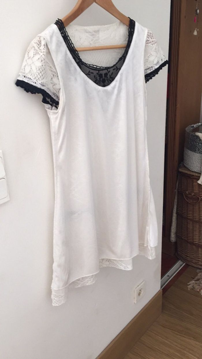 Superbe petite robe en dentelle Doublée donc non transparente Bordée de dentelle noire La dernière photo montre la robe à l’envers pour la doublure Longueur 82cm #robeblanche #dentelle #robedentelle #robesm
