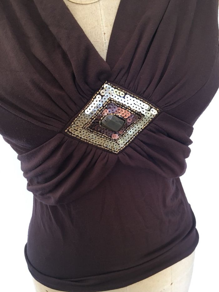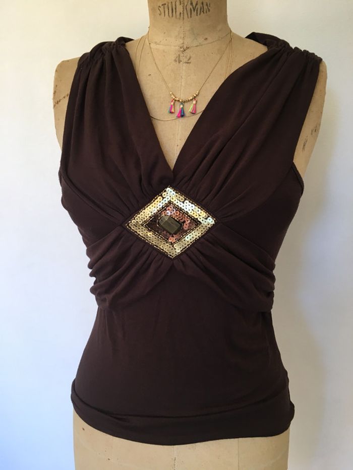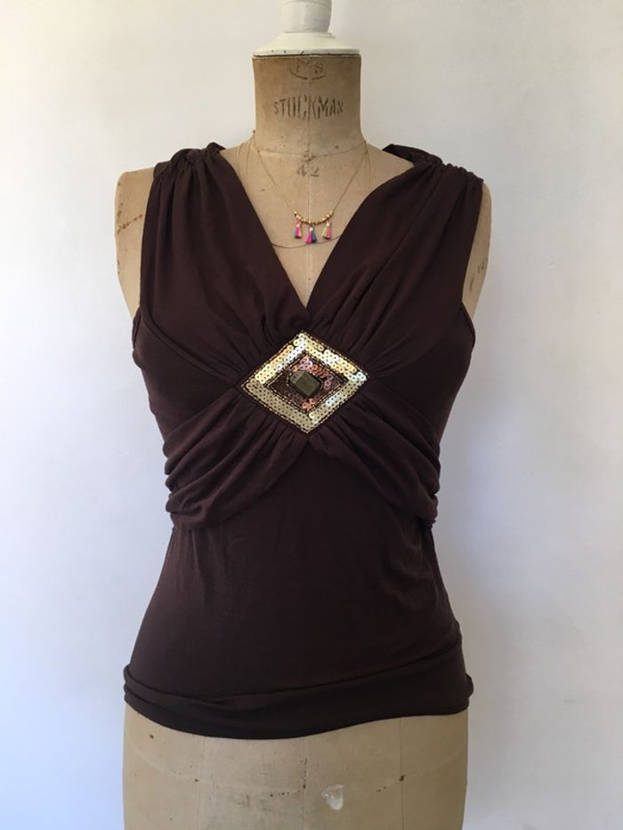 T shirt sans manches marron orné de sequins dorés #vintage #tshirt #tshirtfemmevintage