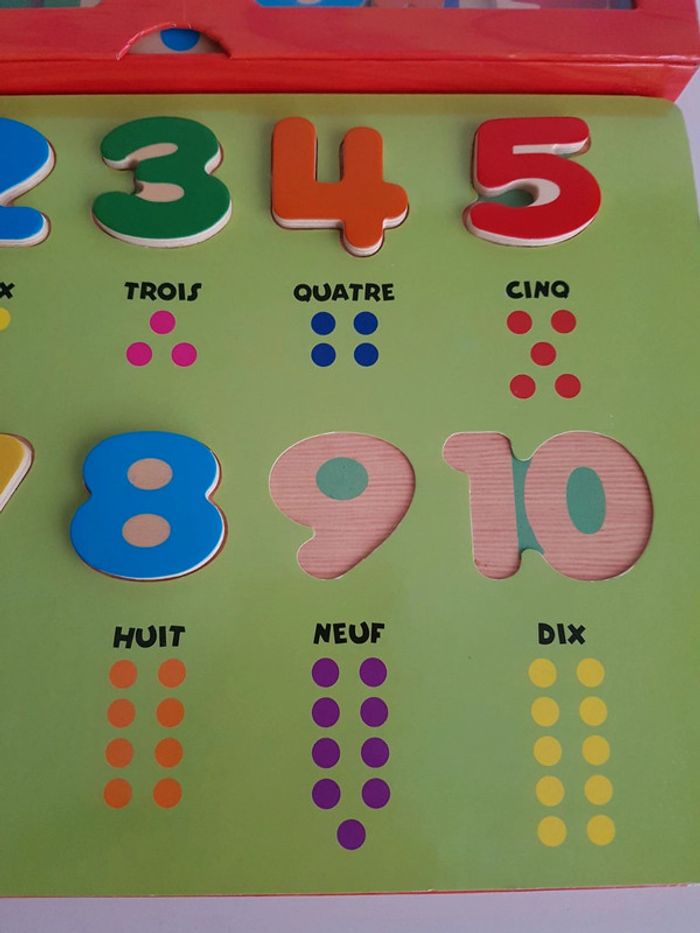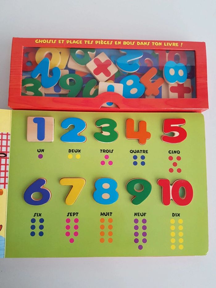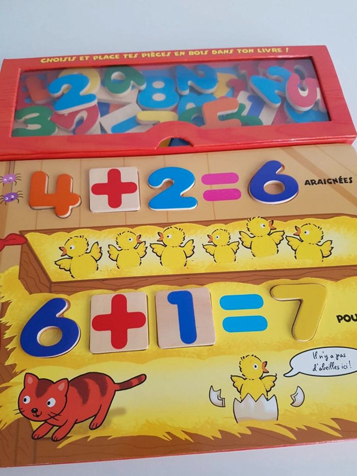 Grand livre Je compte avec les animaux de la ferme et 38 pièces en bois Collection livre puzzle découverte Un livre-jeu interactif et éducatif pour compter de 1 à 10 et s'initier au calcul Jouer avec les pièces en bois pour nommer et compter les abeilles du jardin, les moutons du fermier, les poissons de la mare, les écureuils de la forêt. Il suffit de reconnaître le chiffre demandé et de le placer dans sa forme. Éditions Piccolia Dimensions : 29 × 31,5 cm