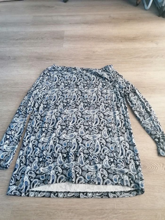 Bonjour, je vends ce tee shirt à manches longues bleu et blanc de la marque Esmara taille 42 en très bon état. Lavé maison non fumeur.