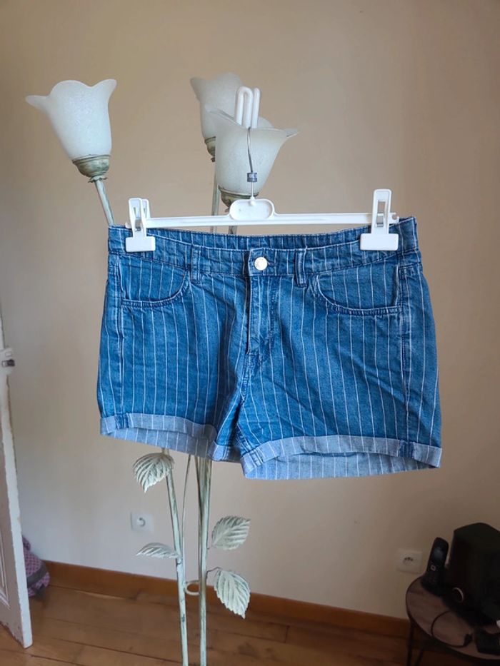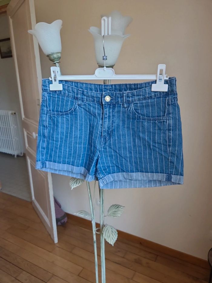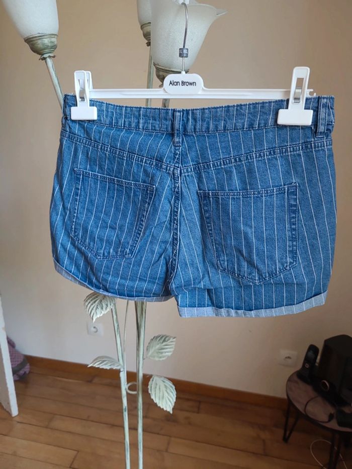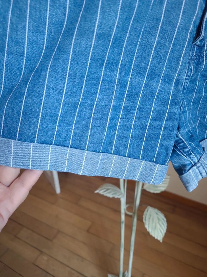 ⬇️mes autres annonces pour femme en taille 42 👉 #cg89femme42 😁 réductions activées des 2 articles ! un short en jean avec de fines rayures blanches. Il mesure 42 cm de taille et 33 cm de longueur. bon état, taille 42 #shortenjean #jean #taille42 #rayure #short
