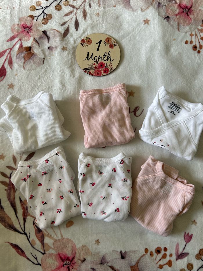 Lot 6 bodies manche courte taille 1 mois Très bon état jamais porté pour la plupart.