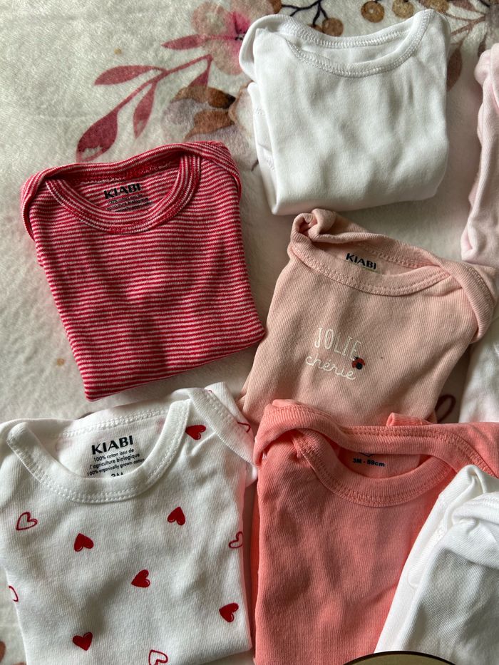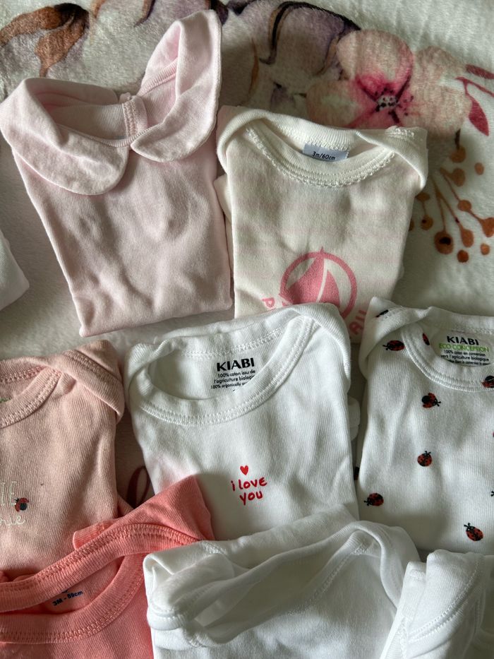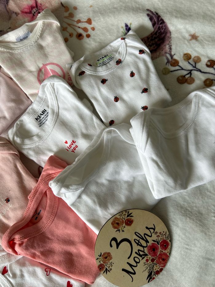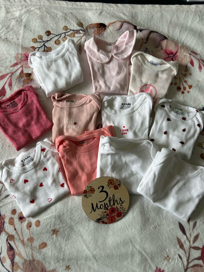Lot 11 bodies taille 3mois manche courte Très peu porté voir jamais porté pour la plupart Marque petit bateau kiabi mot d’enfant et autre