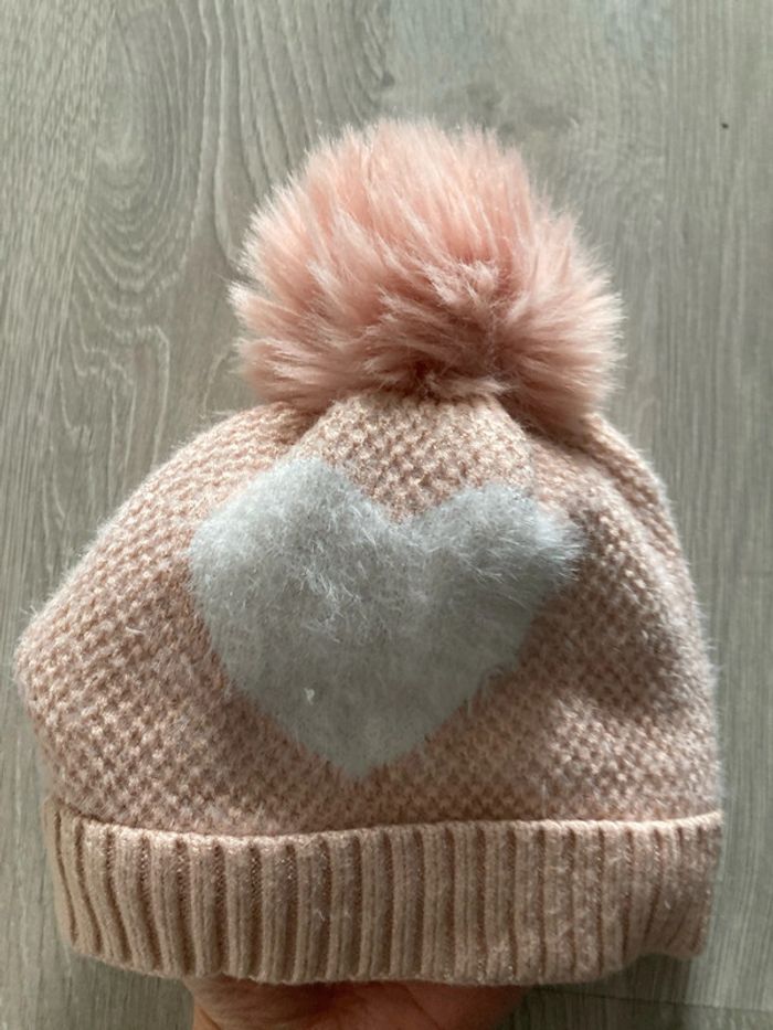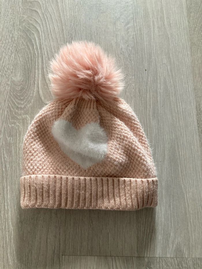 Bonnet fille pompon motif cœur. Intérieur doublé, bien chaud. Taille unique.