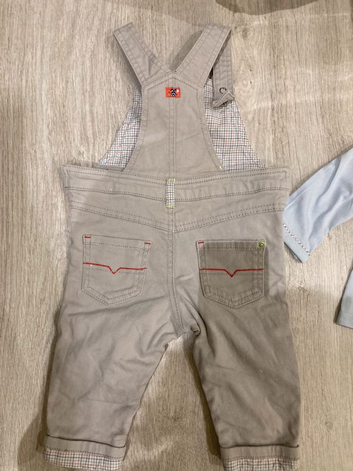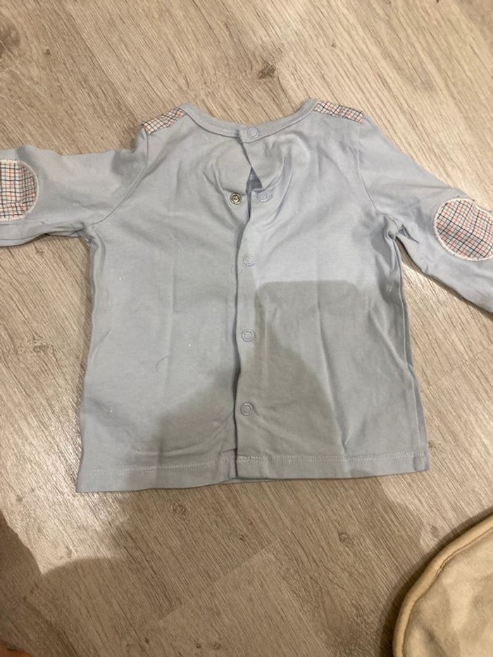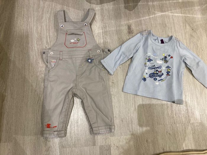 Salopette légèrement épaisse ouverture entre jambes, pressions sur les côtés et bretelles pressions. T shirt manches longues avec coudières, pressions dans tout le dos. Taille 9 mois. #9moisgarçonamelie08000cm