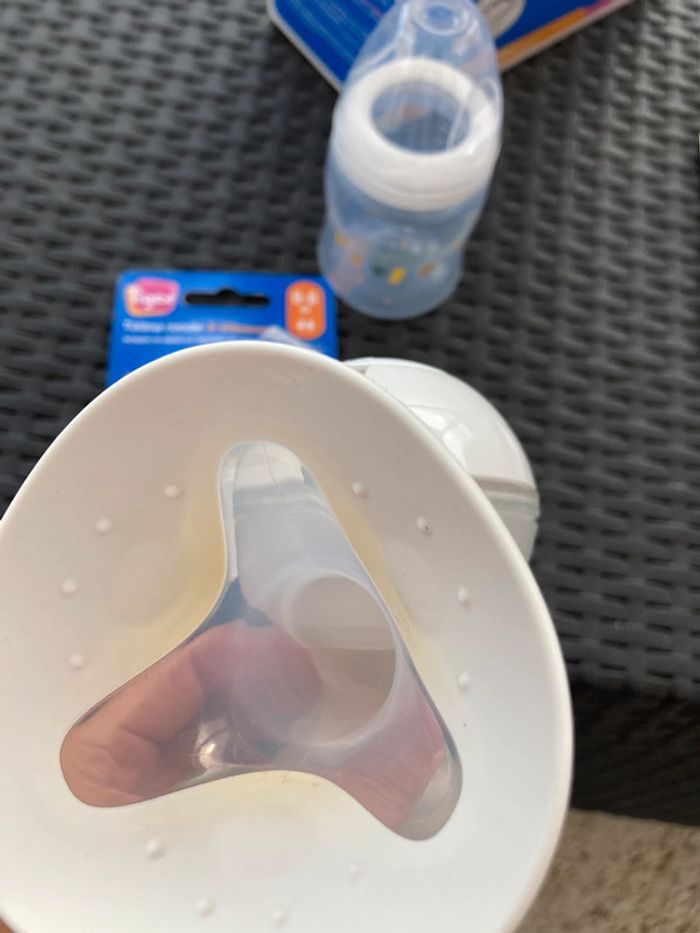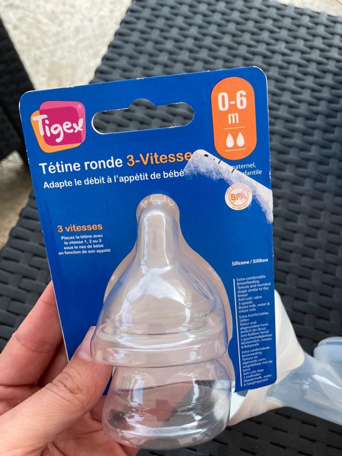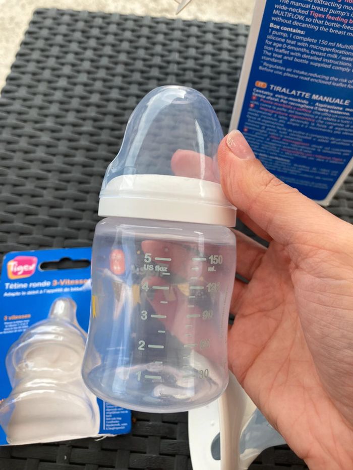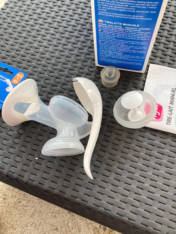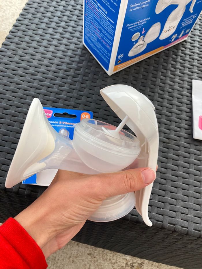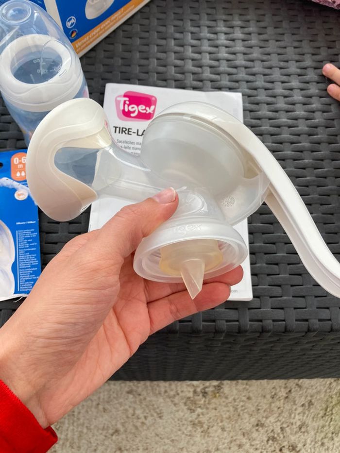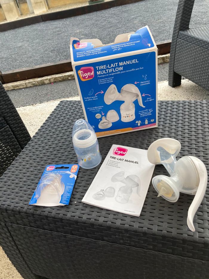 Tire lait manuel, légèrement jauni sur les parties en silicone à cause du lait trop concentré que j’ai pu tirer. Petit biberon de 150ml pour récupération du lait. Je laisse une tétine neuve avec mais le mieux est de prendre les tétines tigex multiflow ou intuition. Toujours stérilisé grâce à des pastilles de stérilisation à froid de la marque Milton.