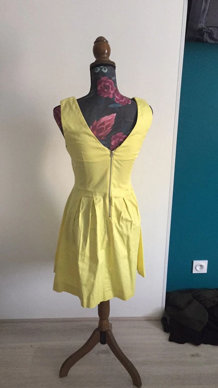 Robe jaune avec fermeture dans ledo s. Effet plissé sur la bas pour donner un effet de volume, cintré sur le haut avec décolleté en V. Comme neuve car très peu porté. Taille 38 #taillemamelie08000cm