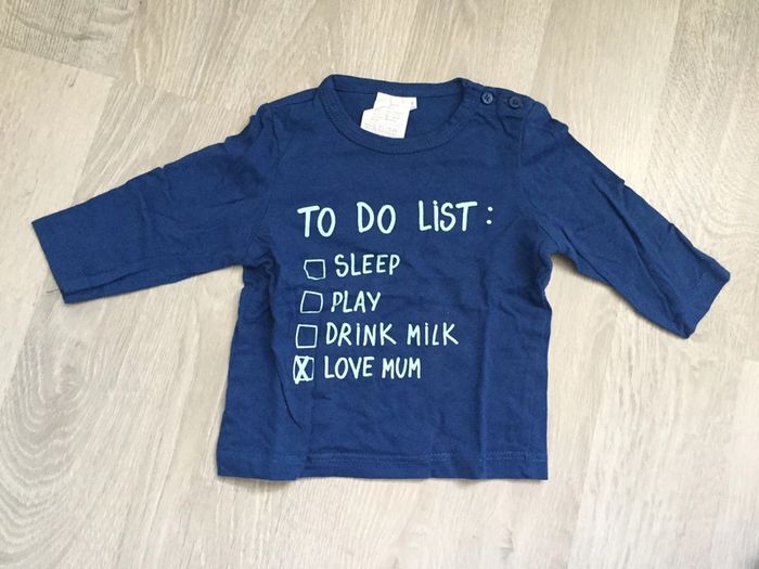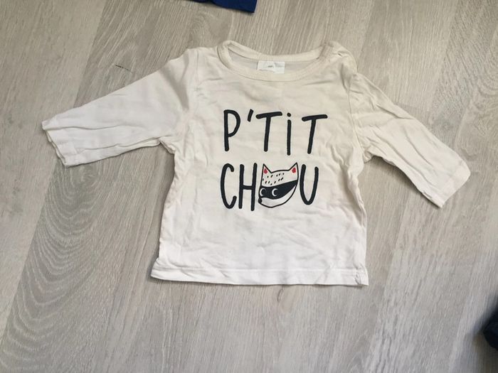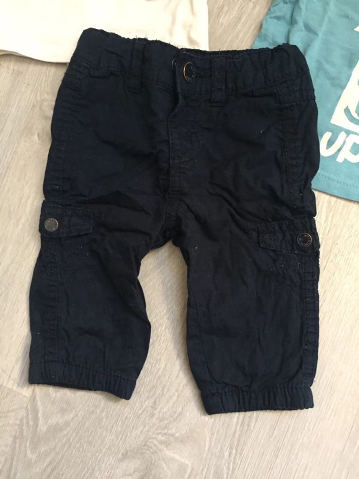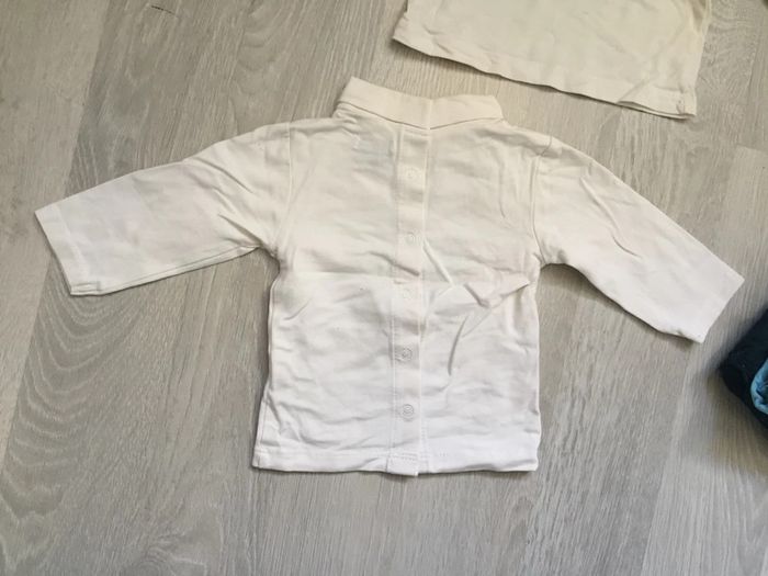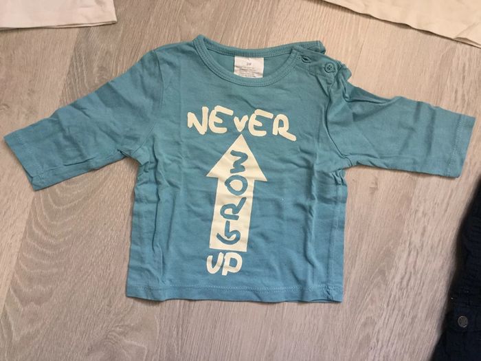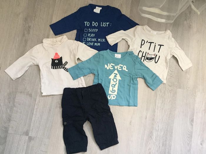Lot de vêtements 3 mois Kiabi comprenant: - 1 pantalon bleu marine - 4 t shirts manches longues dont un avec pressions tout le long du dos #3moisgarçonamelie08000cm