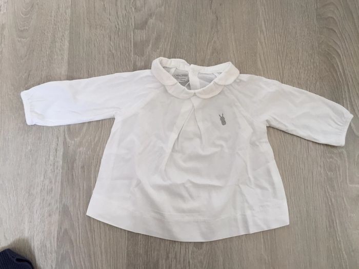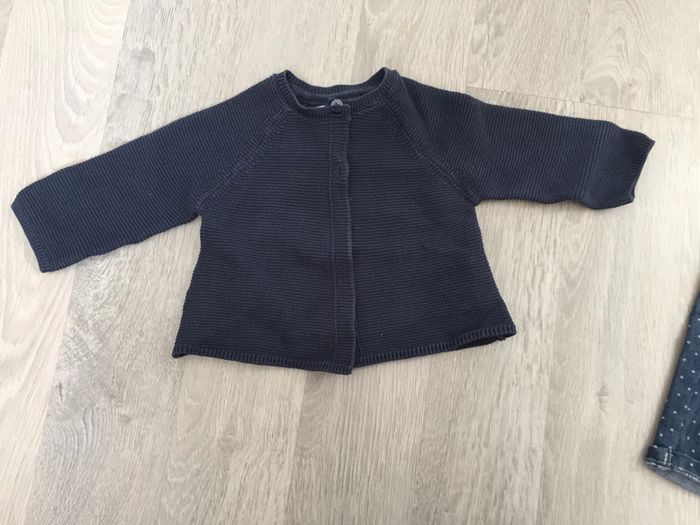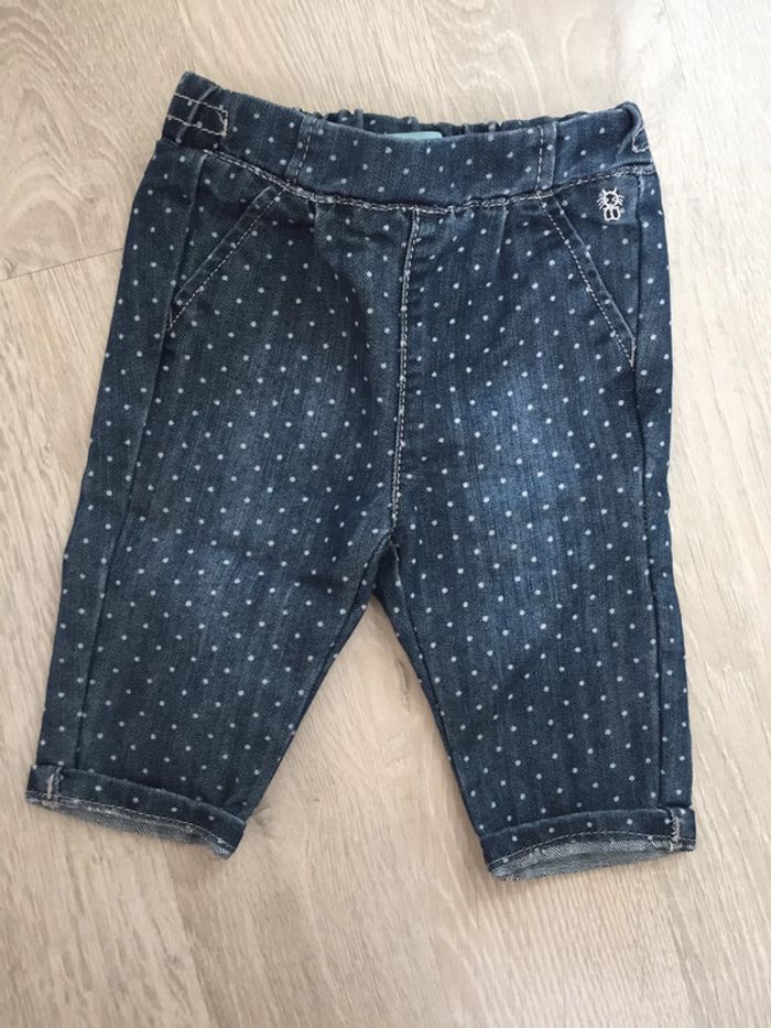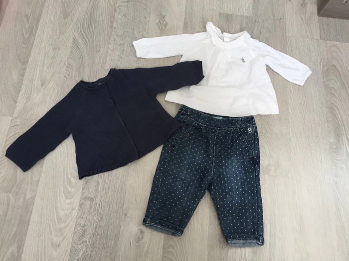 Ensemble 3 mois comprenant: - 1 jean à pois blancs - 1 gilet bleu marine -1 chemisier blanc à col Claudine. excellent état, prix ferme #3moisfilleamelie08000cm #okaidifilleamelie08000cm