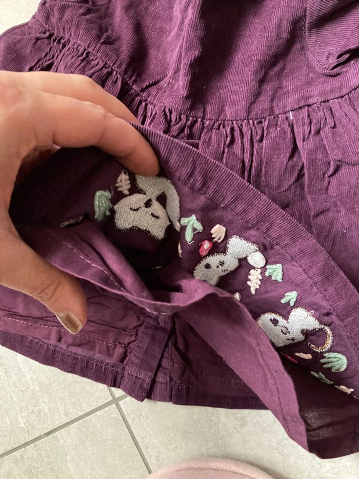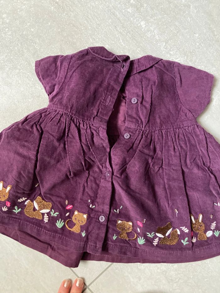 Robe trapèze en velours couleur prune avec motifs renards et lapins sur le bas. Taille 6 mois; Très peu portée #6moisfilleamelie08000cm