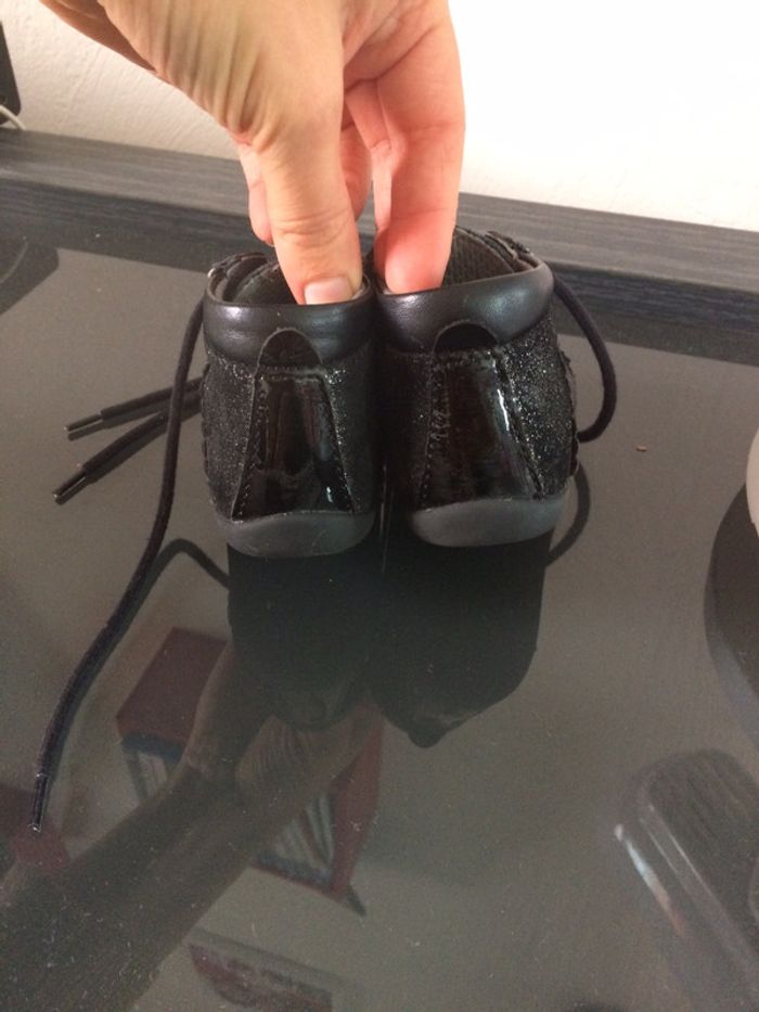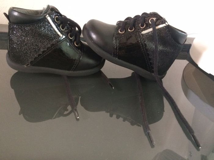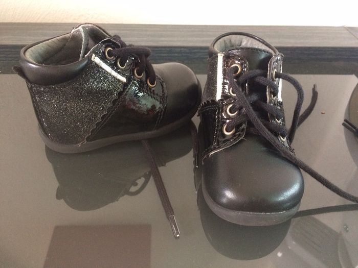 Petits bouilles avec une partie en vernis, une partie en paillettes et une partie classique. Se ferment uniquement par le bais des lacets. Renforts au talon et sur le dessus pour l’apprentissage de la marche. Portés de Mars à Juin pas d’apprentissage de la marche effectué avec. Achetés 34,99€. #chaussuresfilleamelie08000cm
