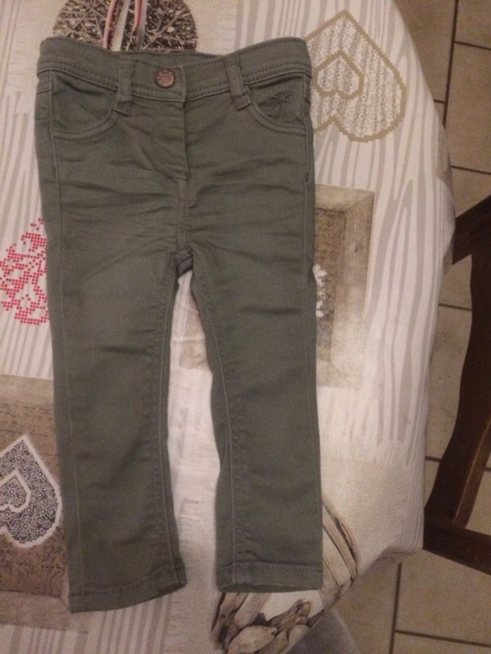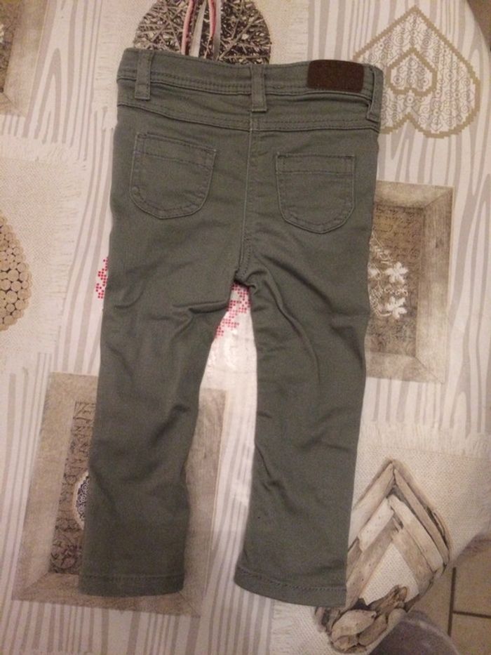 Pantalon skinny très peu porté (2/3fois) car bébé avec de bonnes cuisses. Pantalon en excellent état pouvant dire neuf !! couleur gris/kaki. Idéal avec un T shirt jaune, moutarde, rose, marron, rouge..... Taille 9 mois. #9moisfilleamelie08000cm