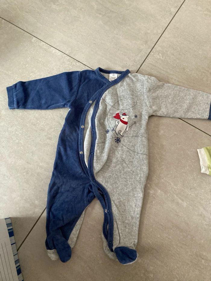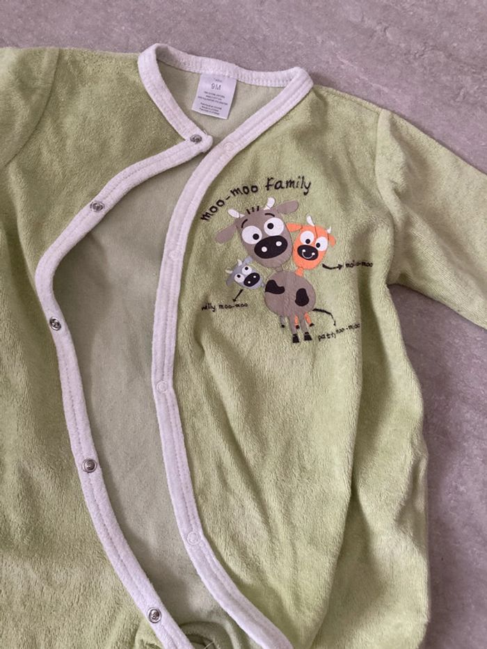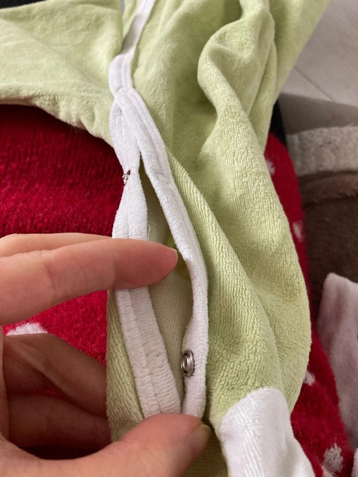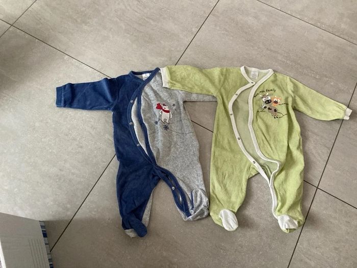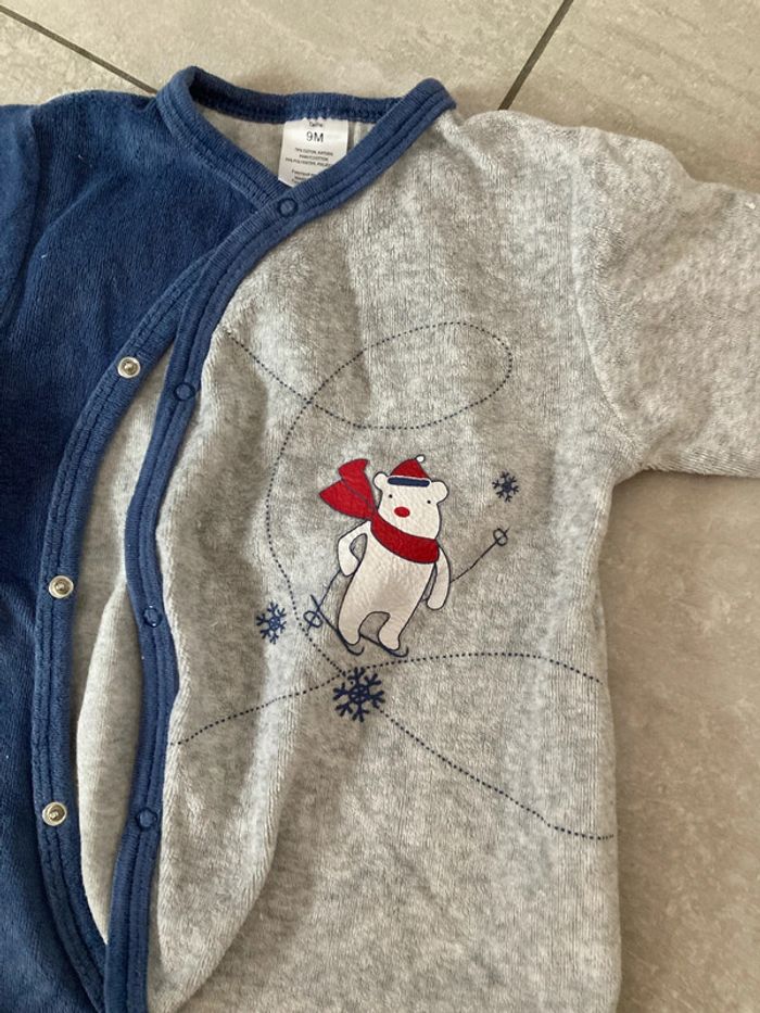 Pyjamas ouverture/fermeture sur le devant, TBE, 9 mois. Manque un morceau de la pression sur le pyjama vert au niveau du pied mais ne gêne pas. #9moisgarçonamelie08000cm
