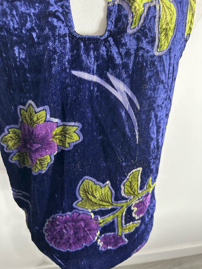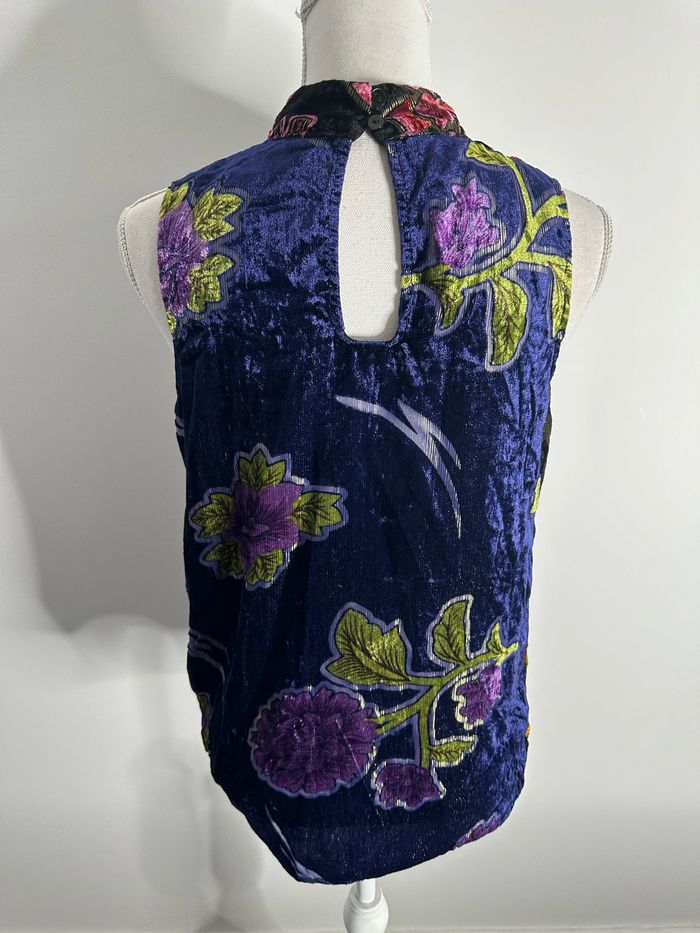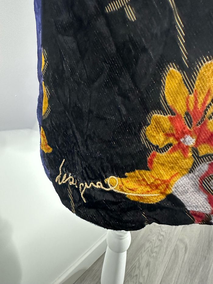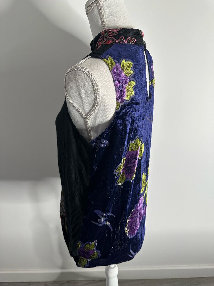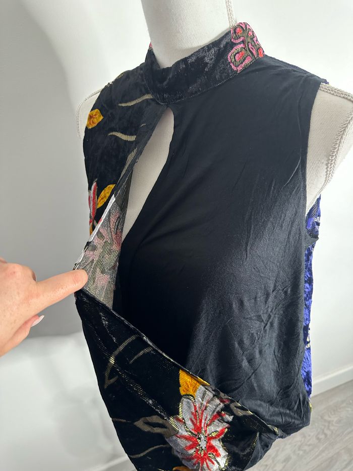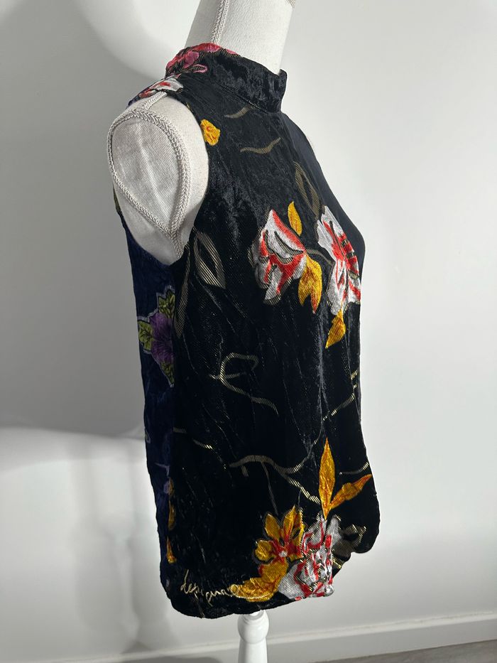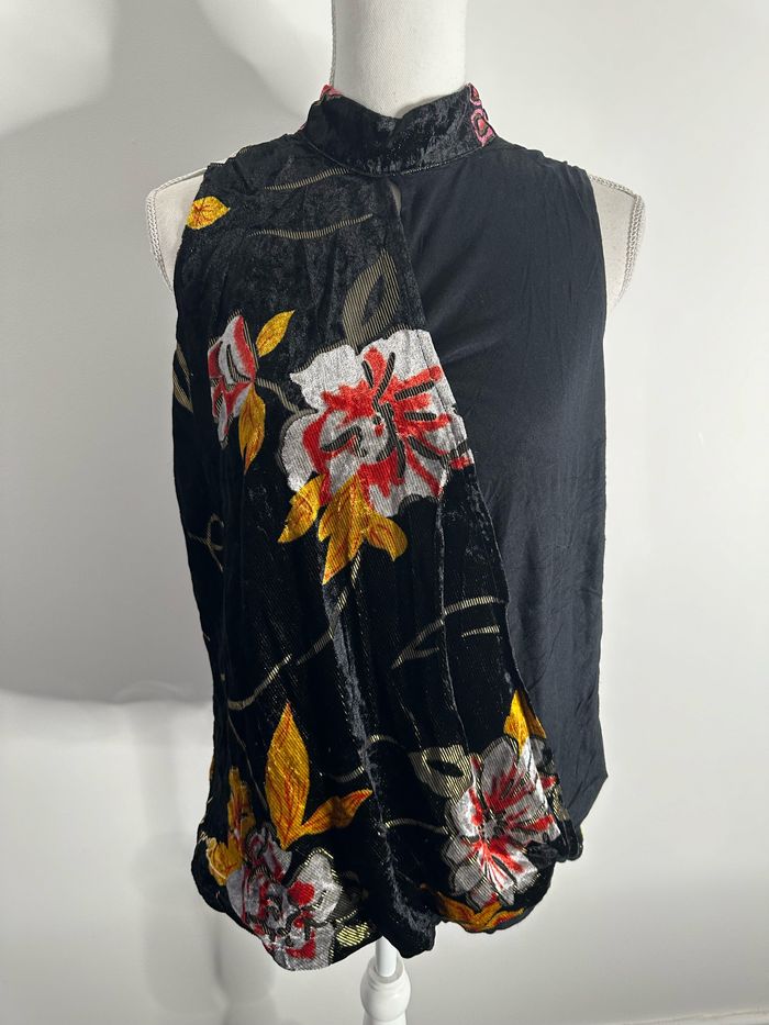 Blouse drapée - Excellent état - Taille 38 équivalent M - Sans manche - Marque Desigual - Noire et multicolore - Tissus velours - Reflets dorés - Imprimés fleurs - Viscose, polyamide, élastane, fibre métallisée