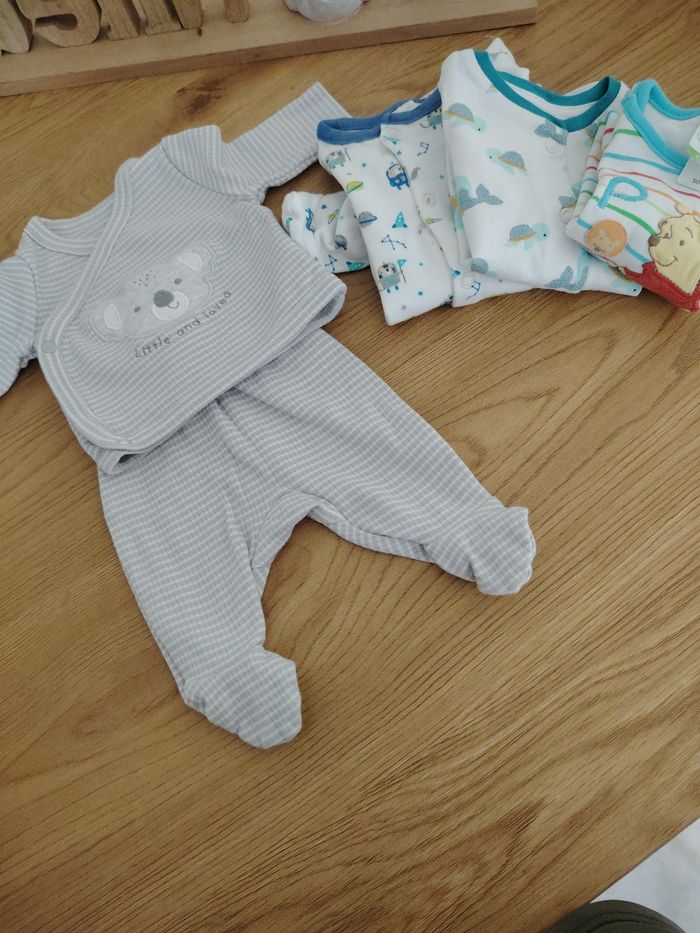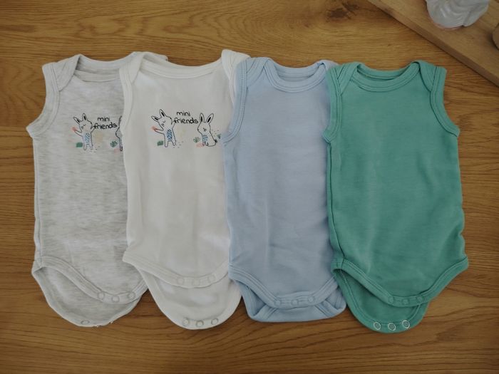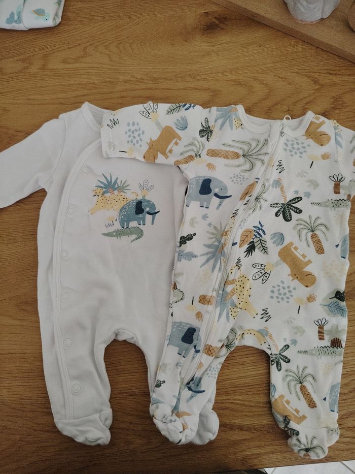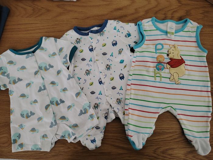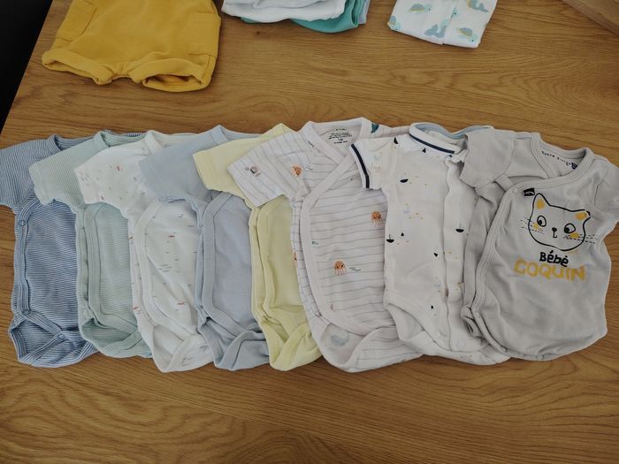 Vend lot 0-1mois garçons sans tâches ni trous contenant En + de 50cm - 8 bodys manches courtes- ouverture sur le devant. -4 bodys sans manches - 6 pyjama coton (1 seul sans ouverture sur le devant) - 2 pantalons - 2 T-shirt - Une salopette - En 50cm : 1 pyjama coton - une combi-short légère- et une combi Winnie - Un ensemble pantalon et pull croisé en coton Plusieurs marques : Kiabi- Gémo- Sucre d'orge- Obaibi-Inextenso-Ptit bisous-C&A-Mot d'enfant et disney