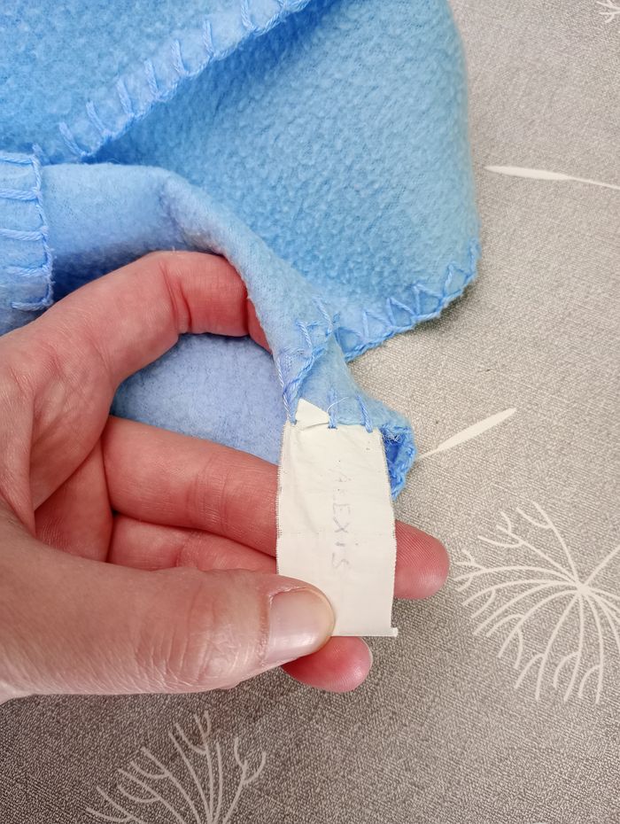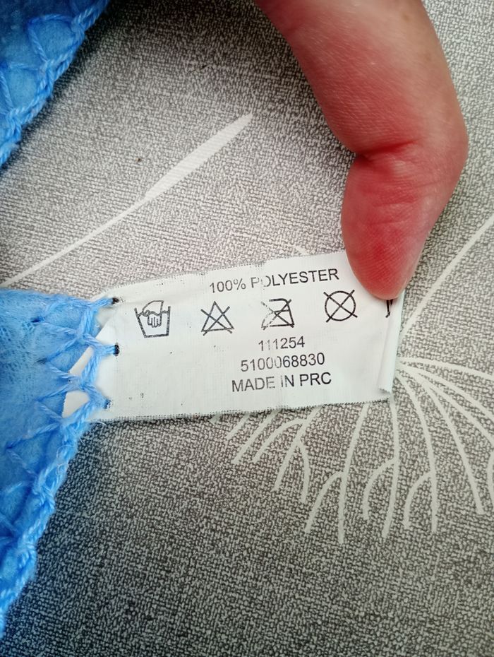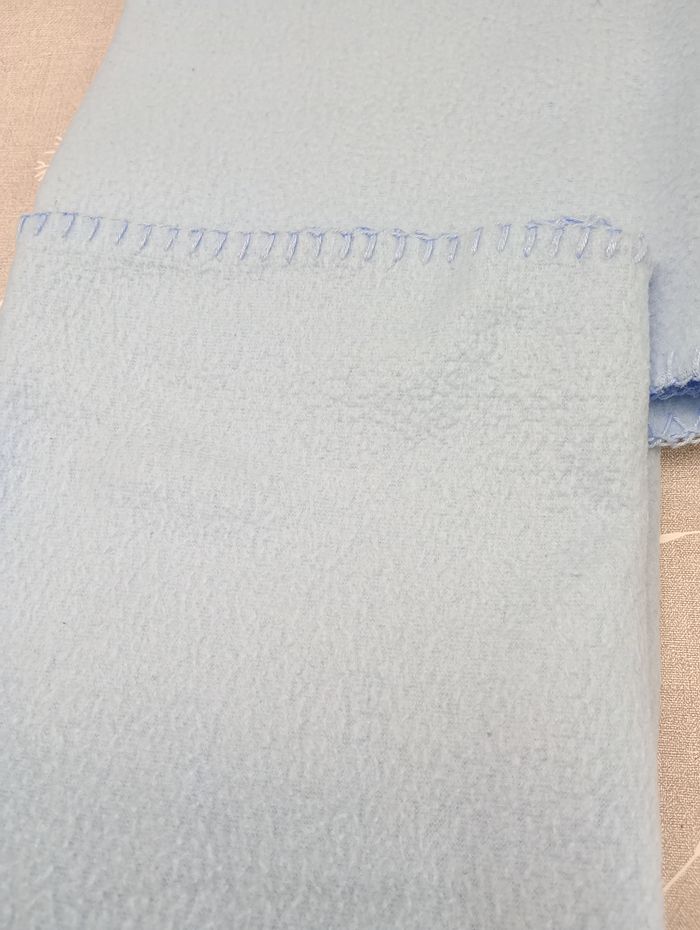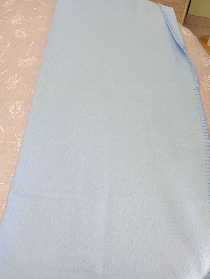 Couverture bleue claire, légère. Polyester. Dimensions : 85 x 115 cm. Bon état.