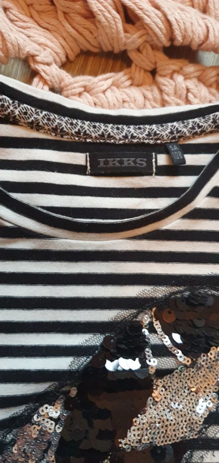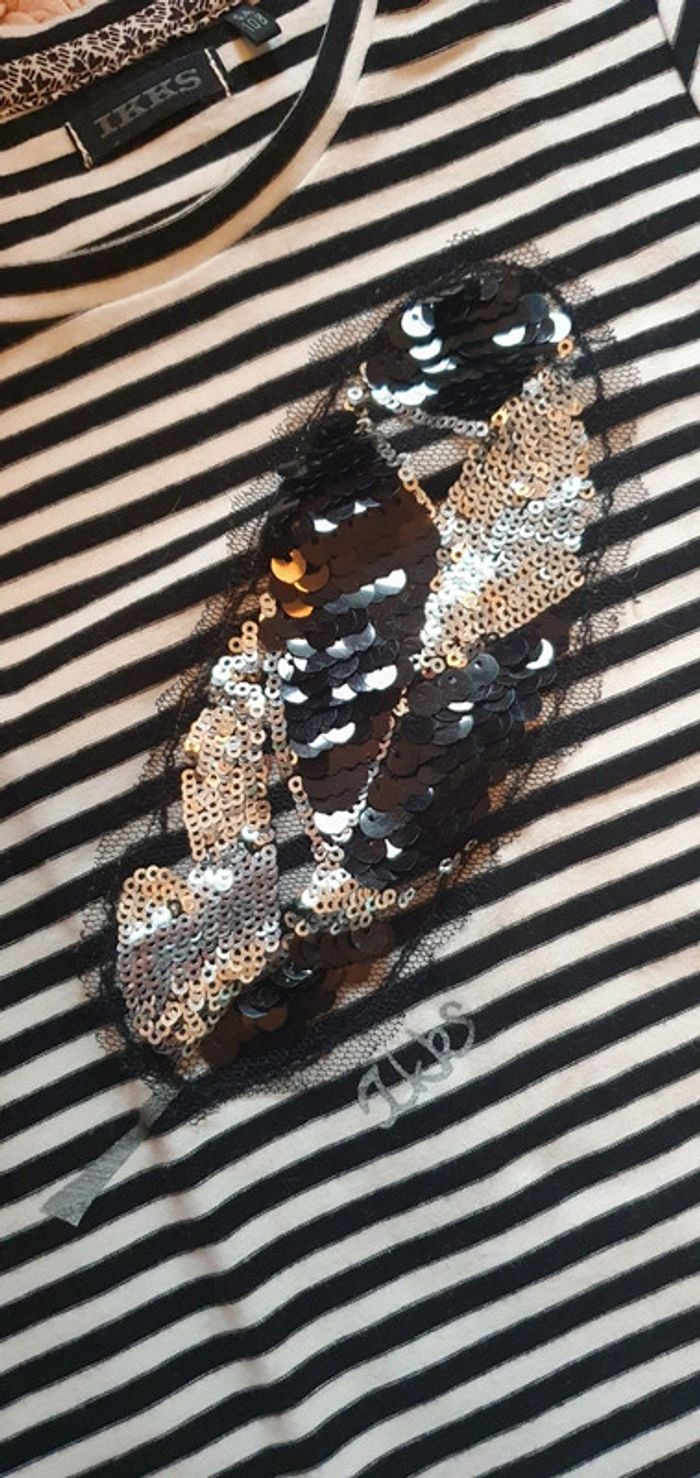 Tee-shirt Ikks taille 5 ans. Esprit marinière. Blanc et noir. Sequins. En excellent état. #le5ansdenina