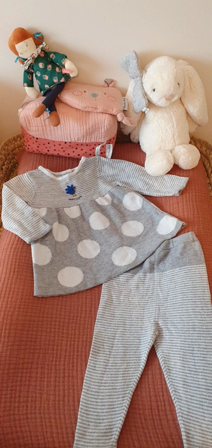 Ensemble Catimini en maille taille 3 mois en très bon état. Très souple et tout doux. La robe pull est entièreté boutonnée dans le dos. Le legging est élastiqué. #le3moisdenina