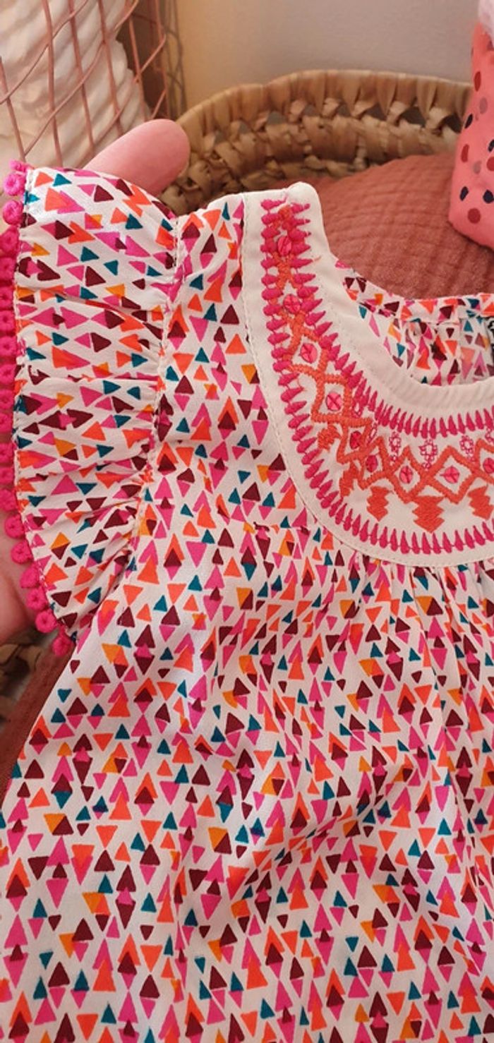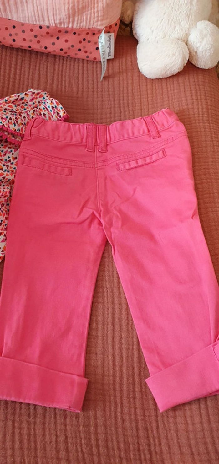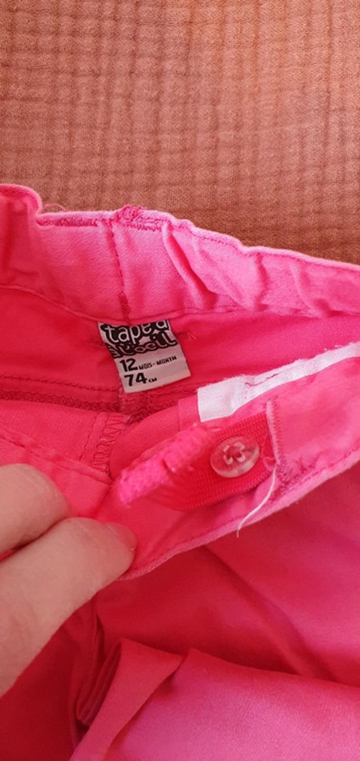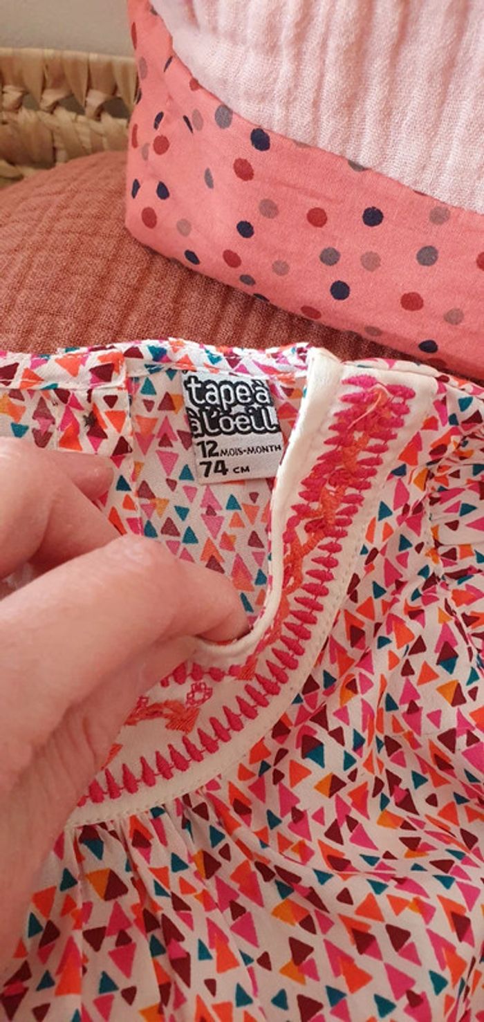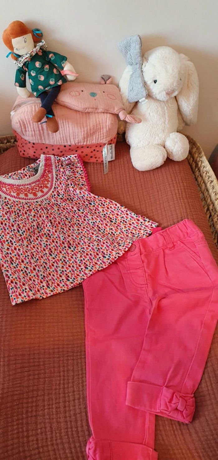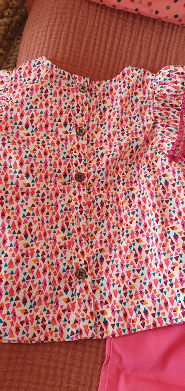 Ensemble TAO Tape à l'œil taille 12 mois composé d'une blouse à manches courtes et d'un pantalon rose. L'ensemble a été bien porté. Il manque un bouton à la blouse dans le dos. Je n'ai pas pris le temps de chercher si j'ai toujours le bouton de rechange. #le12moisdenina