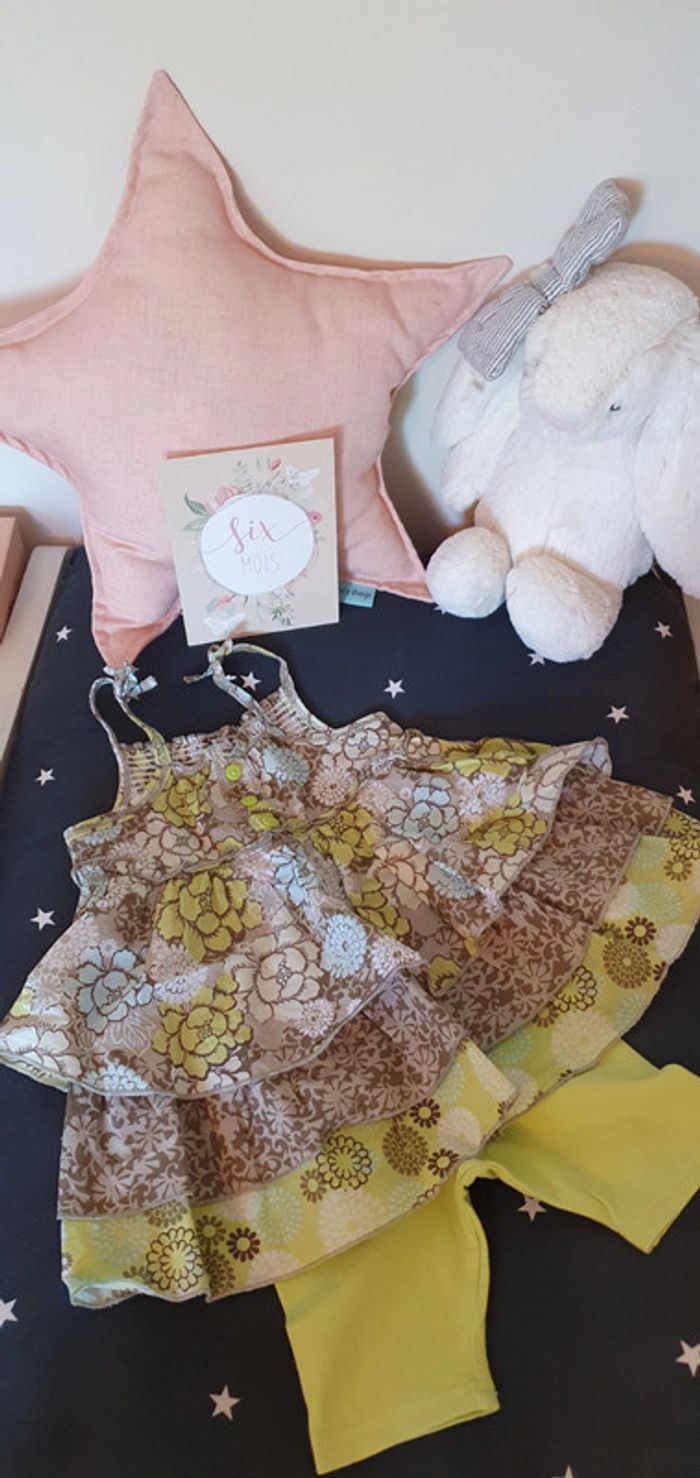Ensemble taille 6 mois en très bon état composé du legging court et de la robe à volants, smockée dans le dos. #le6moisdenina