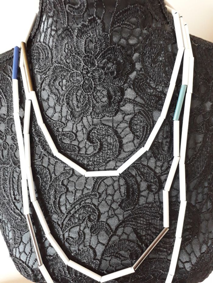 Collier forme sautoir Kookai en très bon état. Perles en métal peint. Peut être porté de différentes manières, en faisant 2 ou 3 fois le tour du cou.