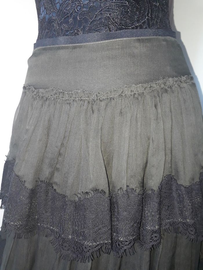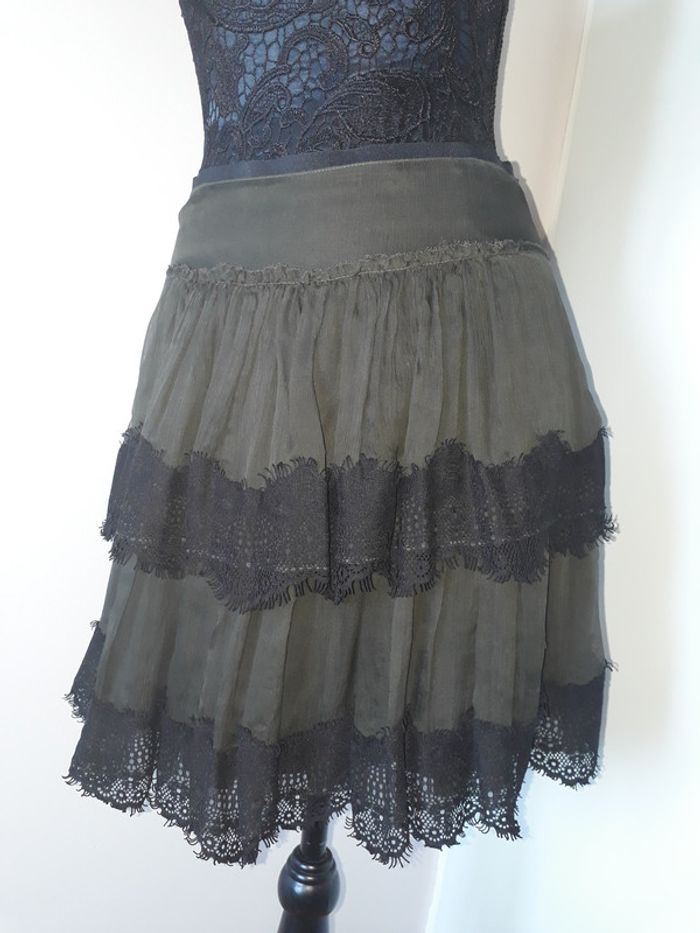 Jupe Essentiel en soie taille 34. Base kaki et dentelle noire. Portée une seule fois pour une occasion, donc comme neuve.