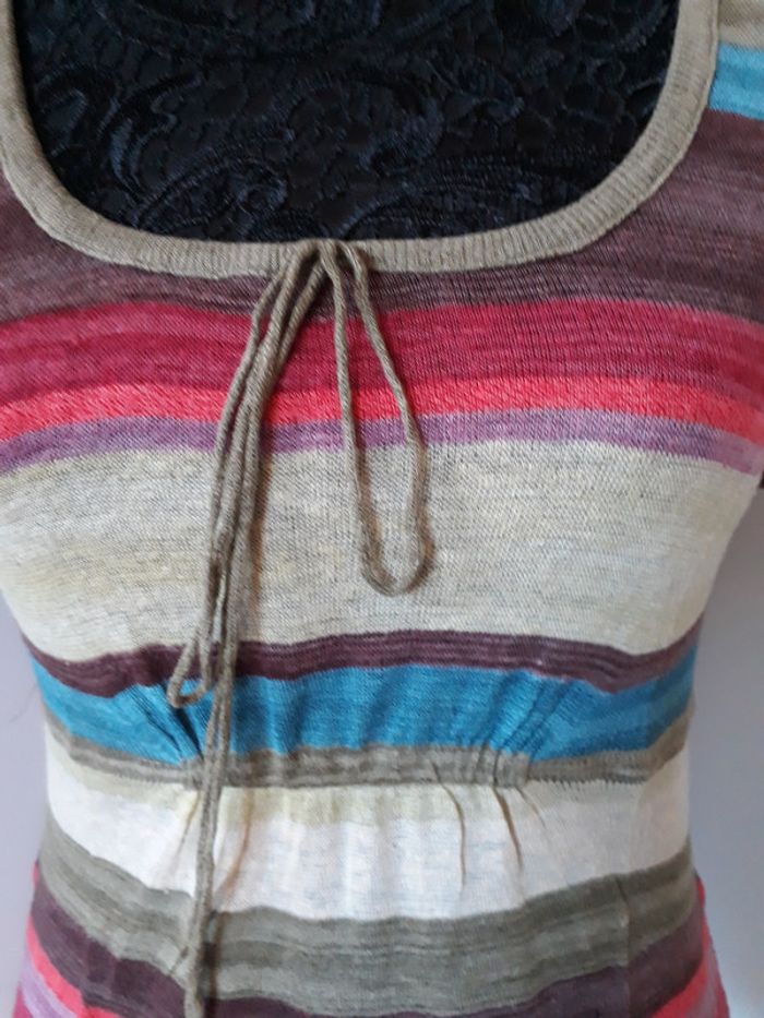 Pull tunique rayé multicolore taille 34 en très bon état. Manches courtes. Cordon à nouer (le décolleté peut être ajusté).