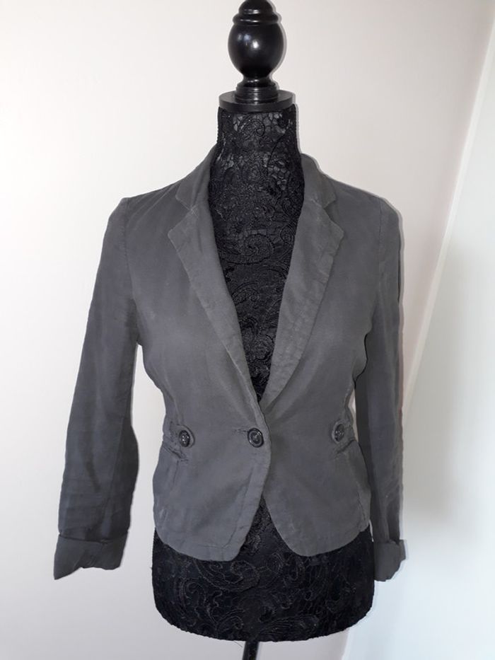 Veste de tailleur grise en lin Comptoir des Cotonniers modèle Direct taille 36 en bon état. Sera lavée et repassée avant l'envoi! 😉