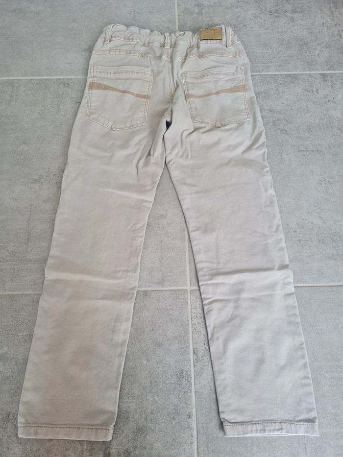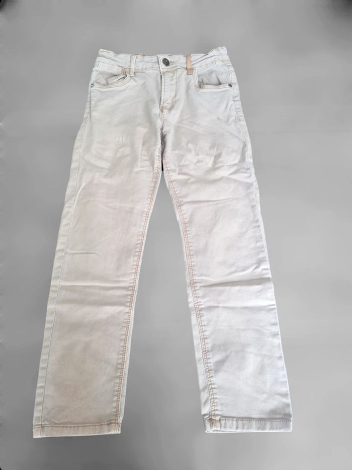 Jeans garçon slim Okaïdi 9 ans. Beige. Élastiques d'ajustement à la taille. Très peu porté, légère tâche (discrète cf photo) pas de trou. Articles lavés avant la vente, maison non fumeur