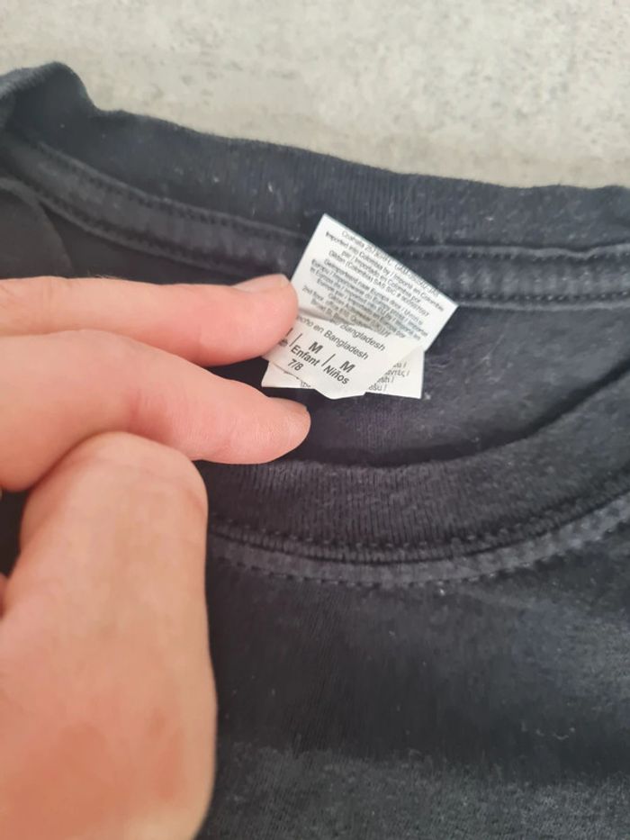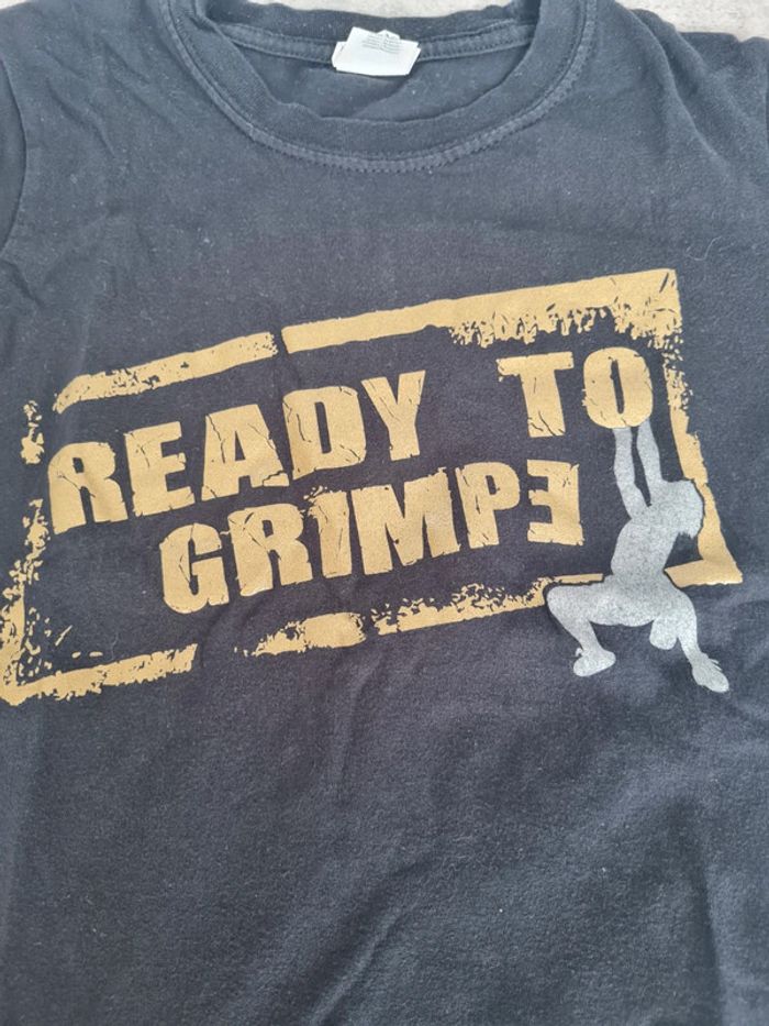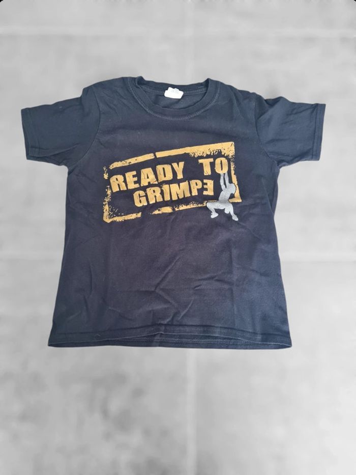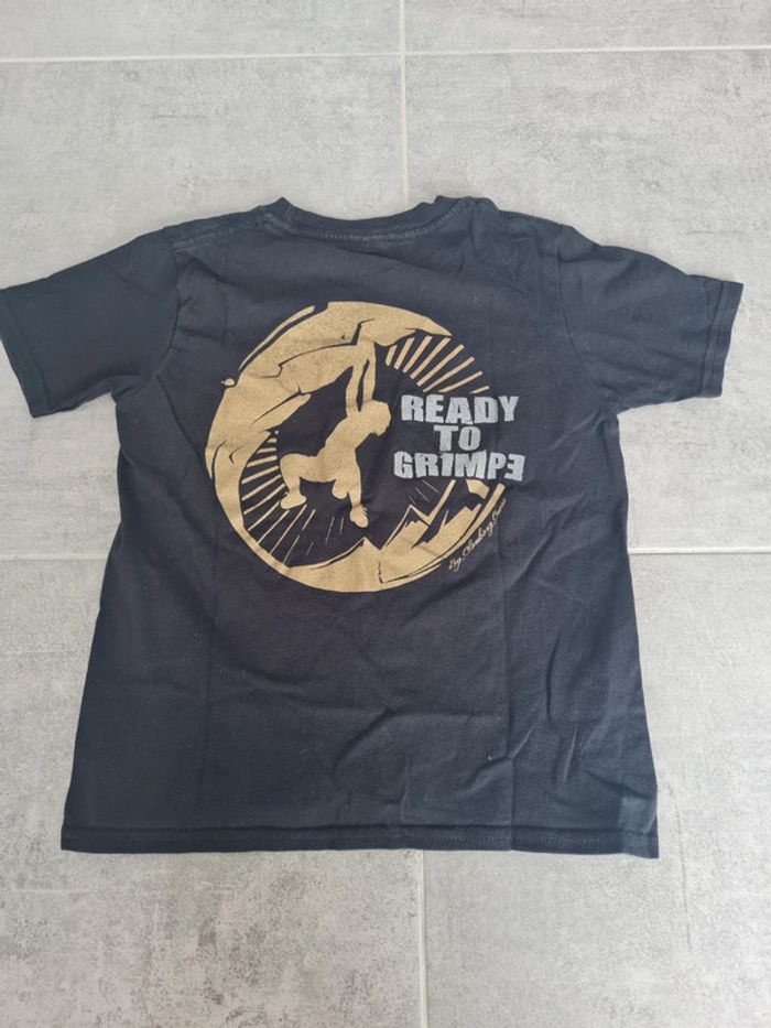 T-shirt manches courtes taille 7-8 ans noir logo doré. Logo club d'escalade. Mixte État neuf Articles lavés avant la vente, maison non fumeur